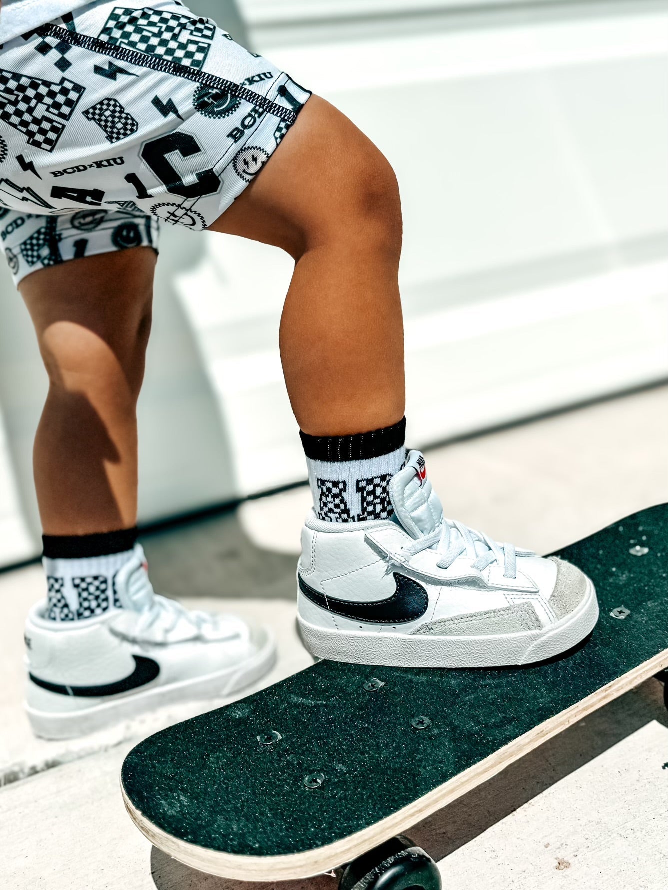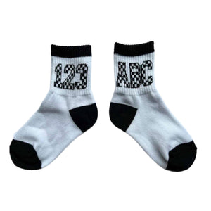 Sizes Infant/XXS, Extra Small, Small + Medium have logo grips on the bottom of the feet and size large have a stitched logo on the bottom of the feet.