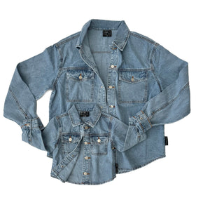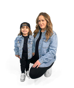 Denim turned style in our anticipated release of our #Matching Adult + Mini Shackets! The perfect blend of the softest denim, this will be a statement piece in all our your fits. Our Denim Shacket features branded snap buttons down the front and around the wrist, making it easier and more comfortable to be in #style! Our 2 front functioning snap pockets are large enough to carry your phone, your wallet and maybe a few snacks in between.
