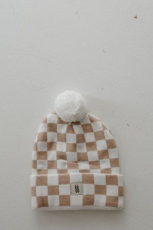 Adult ff Knit Pom Top Beanie | Tan Checkerboard
