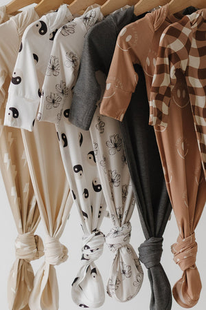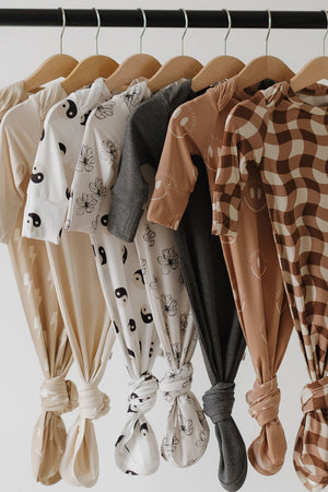 These gowns are a newborn essential. Made with the softest bamboo that is a dream on newborn skin. The knotted bottoms make diaper changes a breeze.