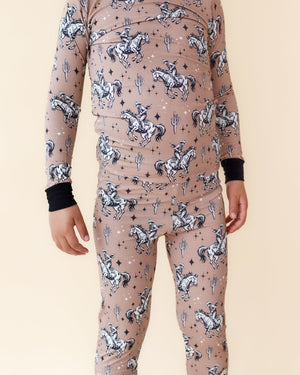 Saddle up! Your little one will adore our Bamboo Two-Piece Set | Desert Cowboy Cutie! Featuring a modern vintage print with a cowboy on horseback, cactuses, and stars, this set is perfect for playtime, photos, and everything in between. Made from a bamboo viscose and spandex blend, it’s soft, stretchy, and oh-so-comfy for your little adventurer. Whether they’re exploring the desert or posing for a family photo, this set is ready for the ride! Available in sizes 18-24M to 9Y, it’s designed for bigger cowgirls and cowboys ready to show off their unique style.