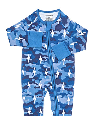 The Bamboo Zip Romper | Blue Camo Bolts brings bold energy and soft comfort together. Featuring a mix of layered blue camo shades and striking white lightning bolts, this bamboo baby romper adds a modern, playful twist to everyday wear. Made from buttery soft bamboo fabric, it’s breathable, stretchy, and perfect for little ones who love to move.