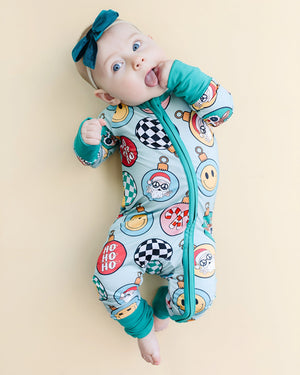 The festive and bright Christmas ornaments on this zip romper are perfect for your little one. Super-soft and stretchy, featuring fold-over mittens and footies. Diaper changes are a breeze with the two-way zipper. Your little one will stay cozy and comfortable, whether it's playtime, nap time, or cuddle time.