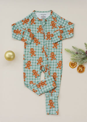 The Bamboo Zip Romper | Gingerbread Gingham is the perfect blend of sweetness and holiday cheer. Featuring a classic gingham pattern adorned with adorable gingerbread friends, this cozy romper wraps your little one in festive warmth and comfort. Crafted from buttery soft bamboo fabric, it’s made for joyful mornings, snug cuddles, and magical nights by the Christmas tree.