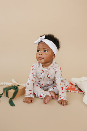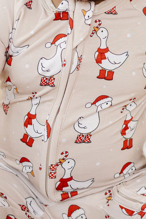 The Bamboo Zip Romper | Merry Goose brings a touch of charm and whimsy to the holiday season. Featuring playful geese dressed in festive scarves and hats, this sweet print captures the cozy joy of winter days. Made from buttery soft bamboo fabric, it keeps your little one snug and happy from morning giggles to bedtime cuddles by the tree.