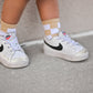 Sizes Infant, Extra Small, Small, Medium have logo grips on the bottom of the feet large have a stitched logo on the bottom of the feet.
