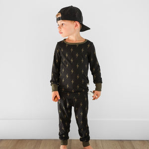 Our same amazing jammies in a brand new Olive lightning bolt print! The coziest rad jammies ever! Dress your toddler in the same soft and stretchy bamboo as our zipper jammies, but in a two-piece set that’s easier for potty training. Featuring long sleeves and matching long pants.