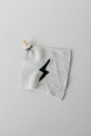 The softest lovey made of microfiber feather yarn. Features a black lightning bolt on a white background.