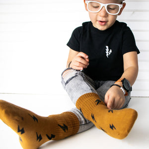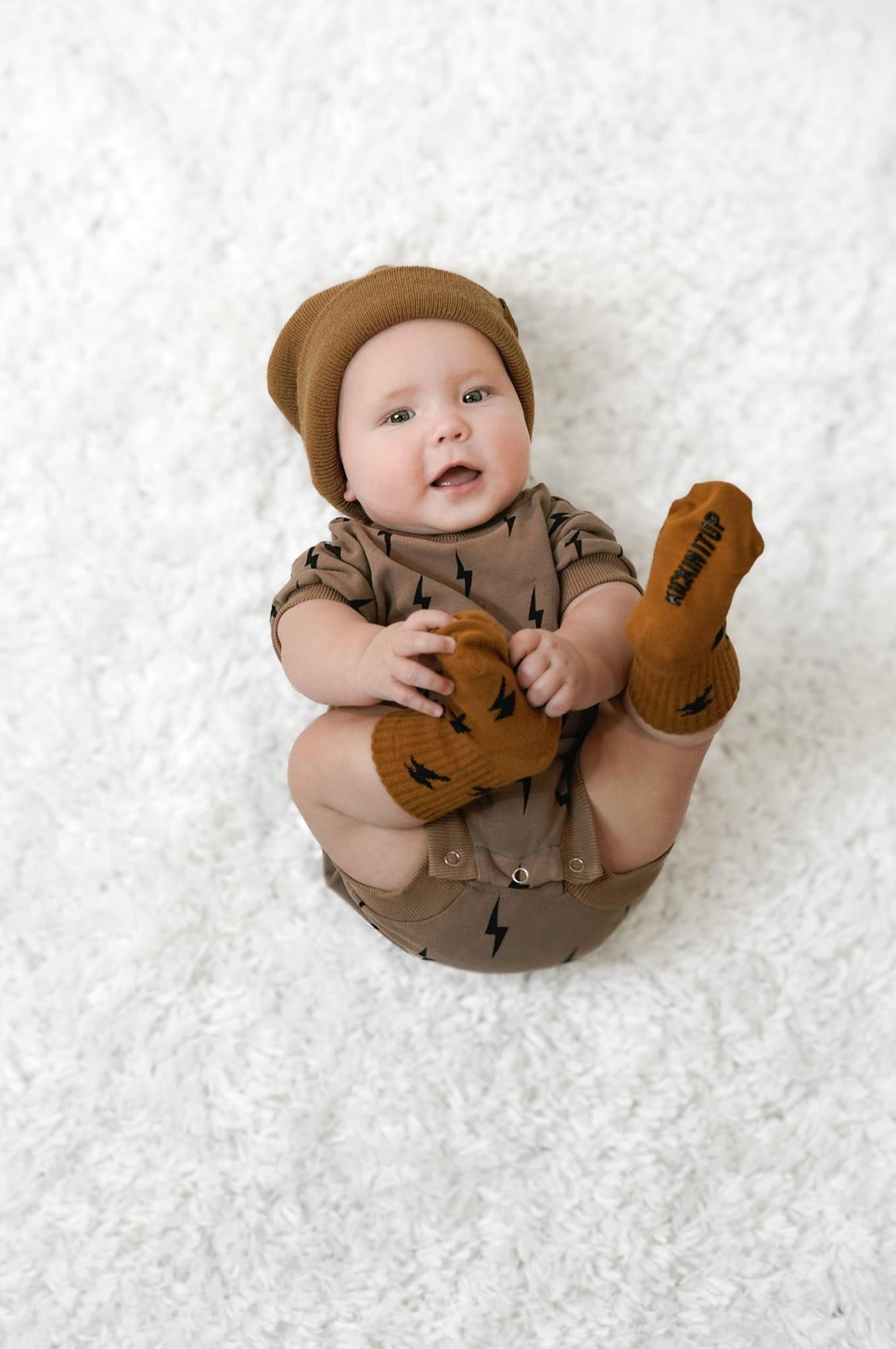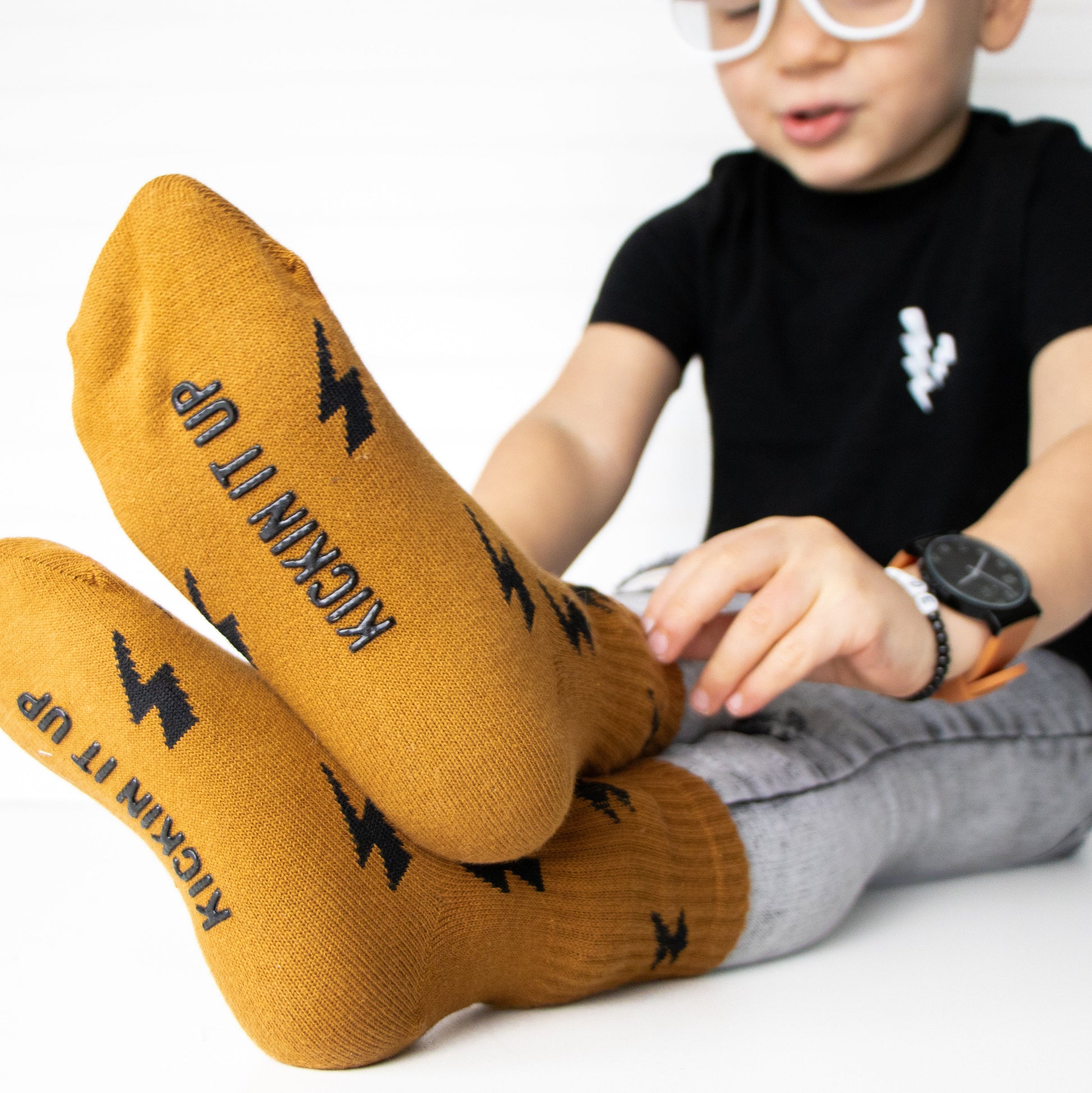 Sizes Infant/XXS, Extra Small, Small + Medium have logo grips on the bottom of the feet and size large have a stitched logo on the bottom of the feet.