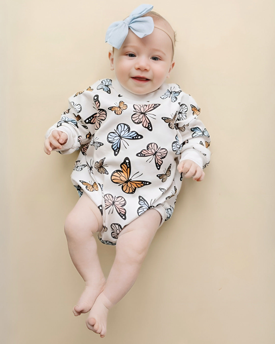 Upgrade your kid's wardrobe with our Butterfly bubble romper! The lively butterflies on this long sleeve bubble romper are sure to catch eyes. Made from a 95% cotton and 5% spandex mix, it's ultra-comfy and stylish for your energetic little tot.