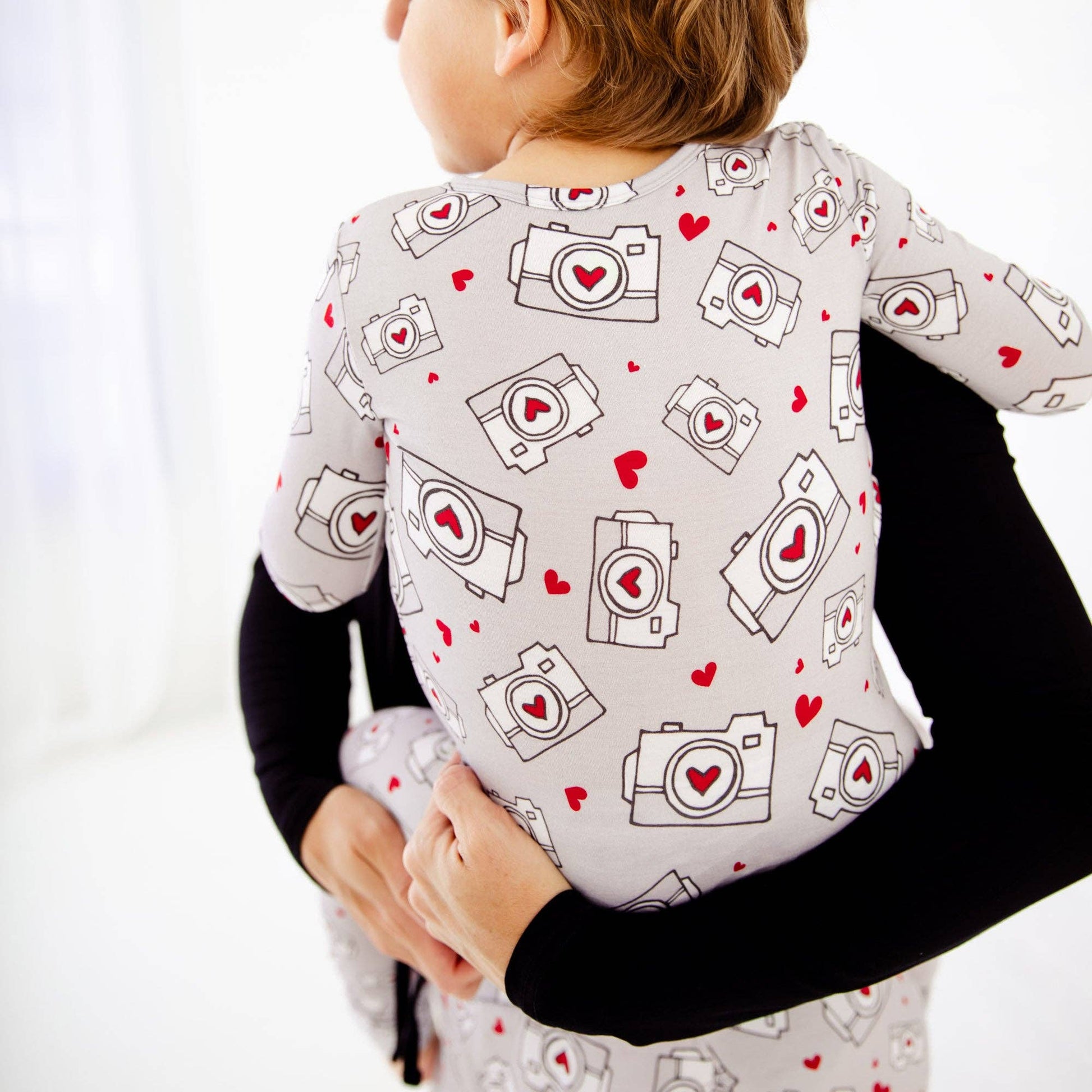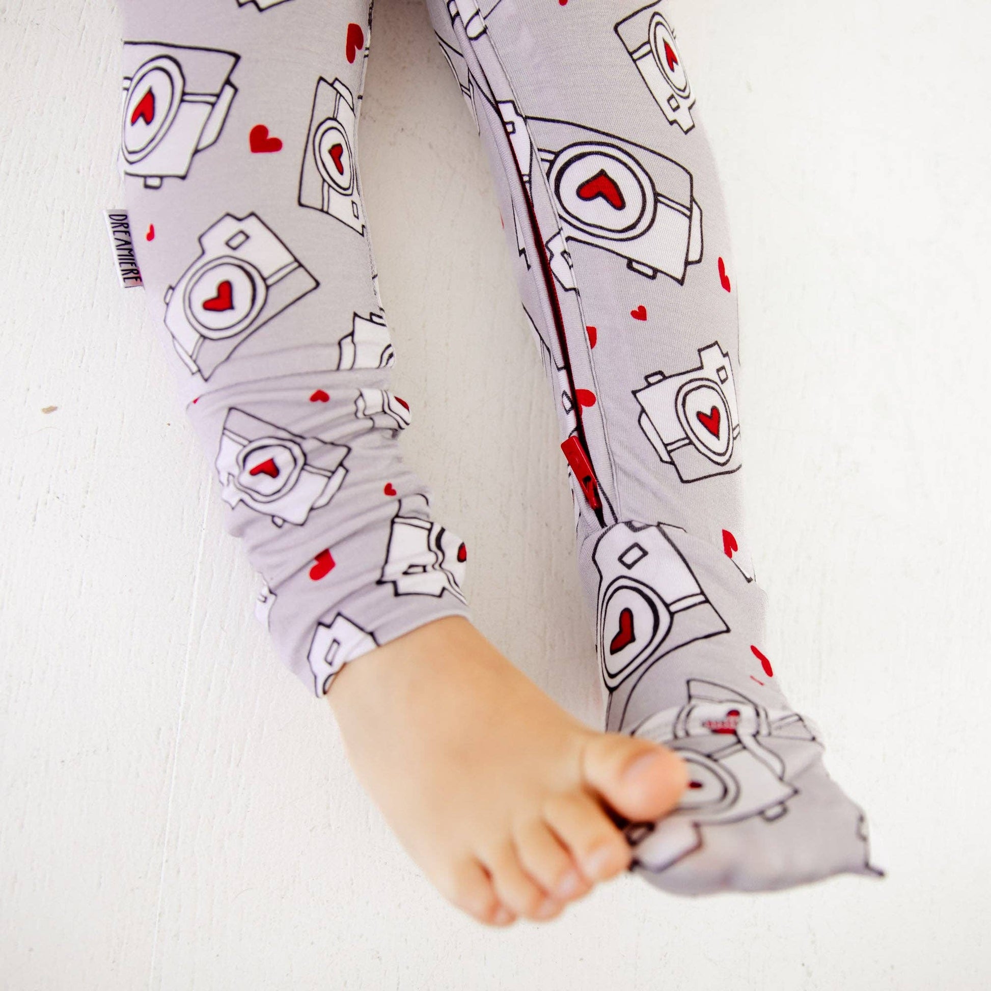 These vintage cameras on a soft grey background with a pop of red hearts, make this a fun collection for valentine's day and beyond! Whether you prefer a footie or romper, this all-in-one convertible piece does it all! Made with two way zippers for easy diaper changes, this adorable romper features fold over cuffs on the ankle which converts this romper to a footie as desired. This piece is designed to last twice as long as the average footie, due to the extra length and super stretchy fabric. * 95% Viscose from Bamboo, 5% Spandex * 0-3mo, 3-6mo and 6-12mo sizes also feature fold over hand cuffs. * Our Fabric is not treated with harsh chemicals * Tagless!