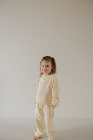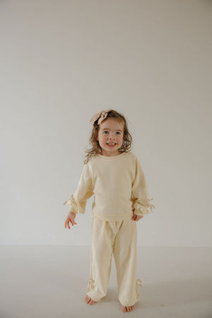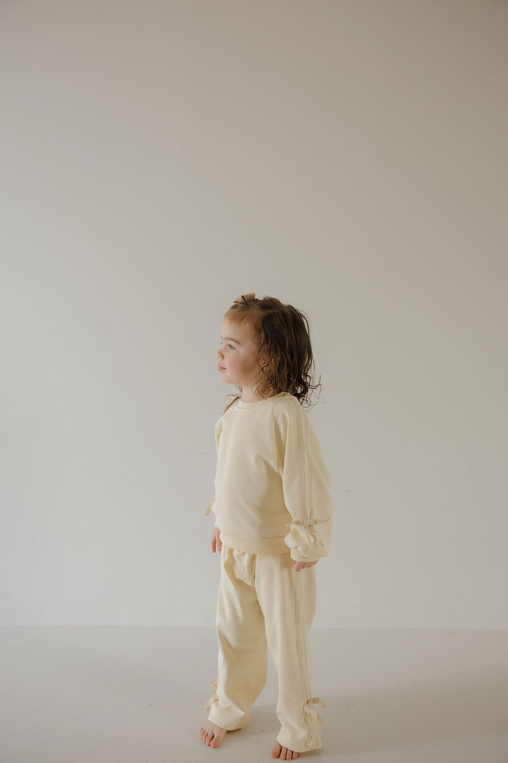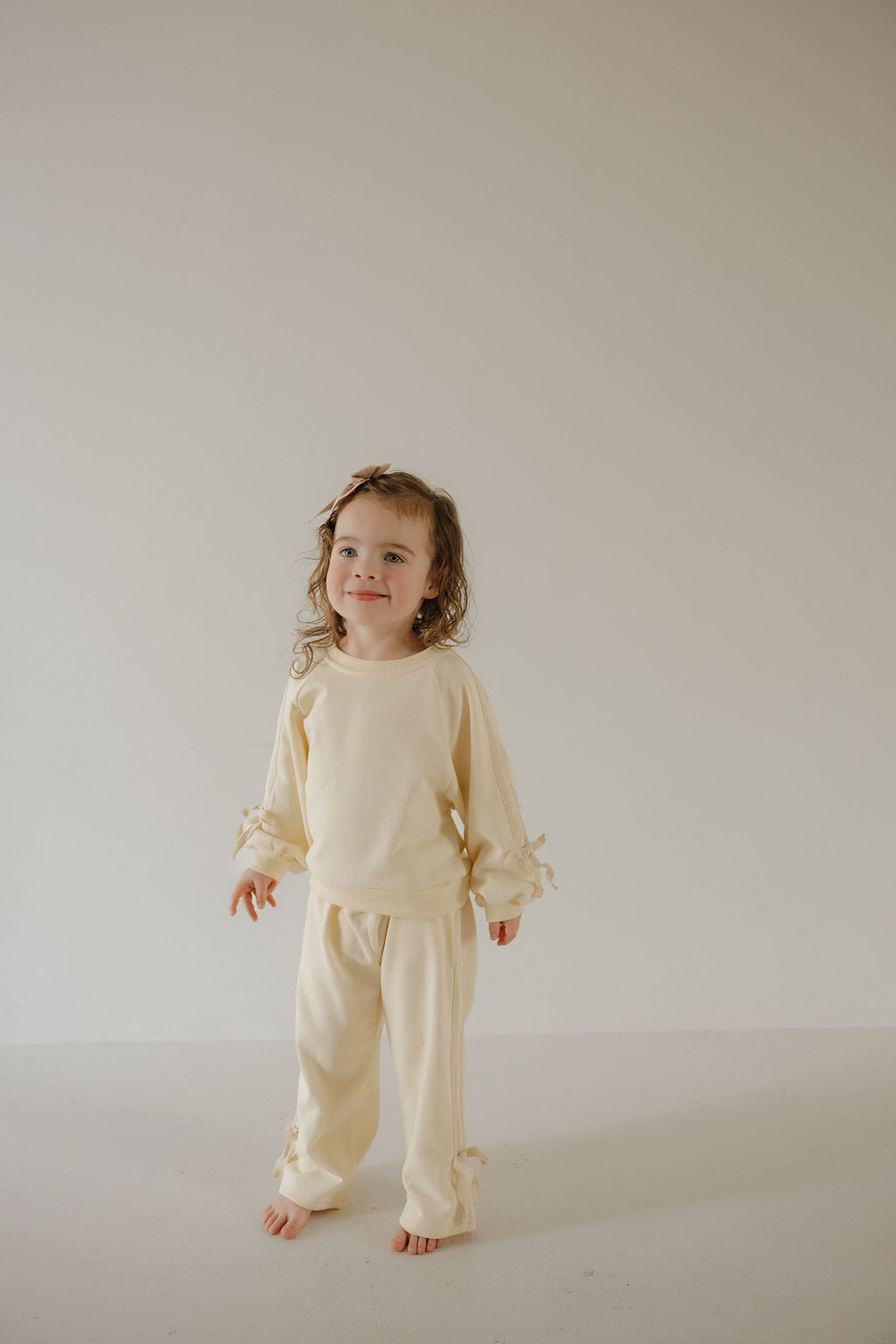 Made for play, school, and everything in between, this children’s sweat set is as comfortable as it is versatile. Finished with sweet bow details, it’s easy to wear and perfect for everyday adventures—a must-have in any little one’s wardrobe. Match it with the women’s sweat set and coordinating baby rompers for the complete family look.