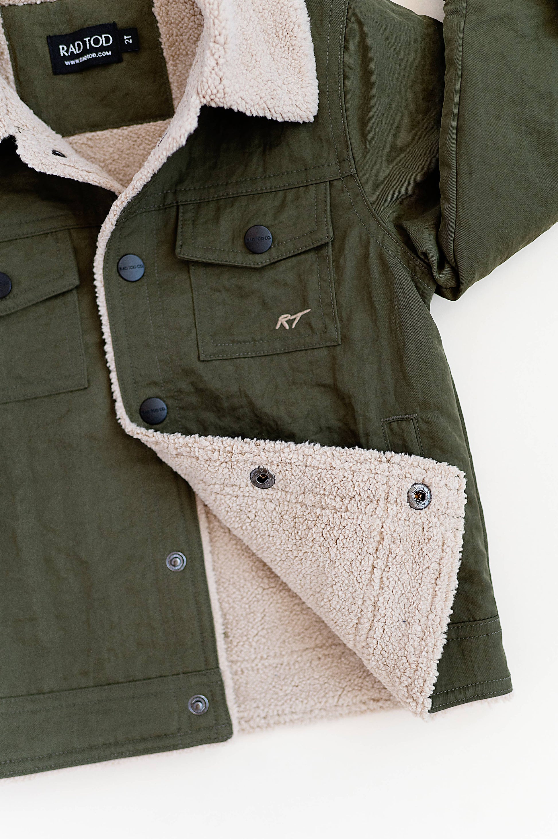 Say hello to the water resistant jacket that your toddler will have on repeat this season! Our medium weight jacket is lined with a soft sherpa that will keep your little one cozy during those cold days, featuring a sherpa lined collar and a subtle but cool embroidery on the chest pocket. Outer material is water resistant.