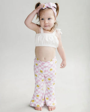 This two piece flare set for baby girls is crafted to perfection with a soft cotton fabric, making it both comfortable and stylish. The set includes an adorable tie shoulder cropped top and cotton bell bottoms, giving it an adorable boho look. Perfect for keeping your little one cool and fashionable in the warmer months.