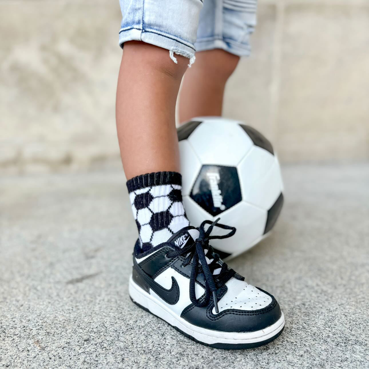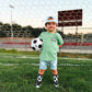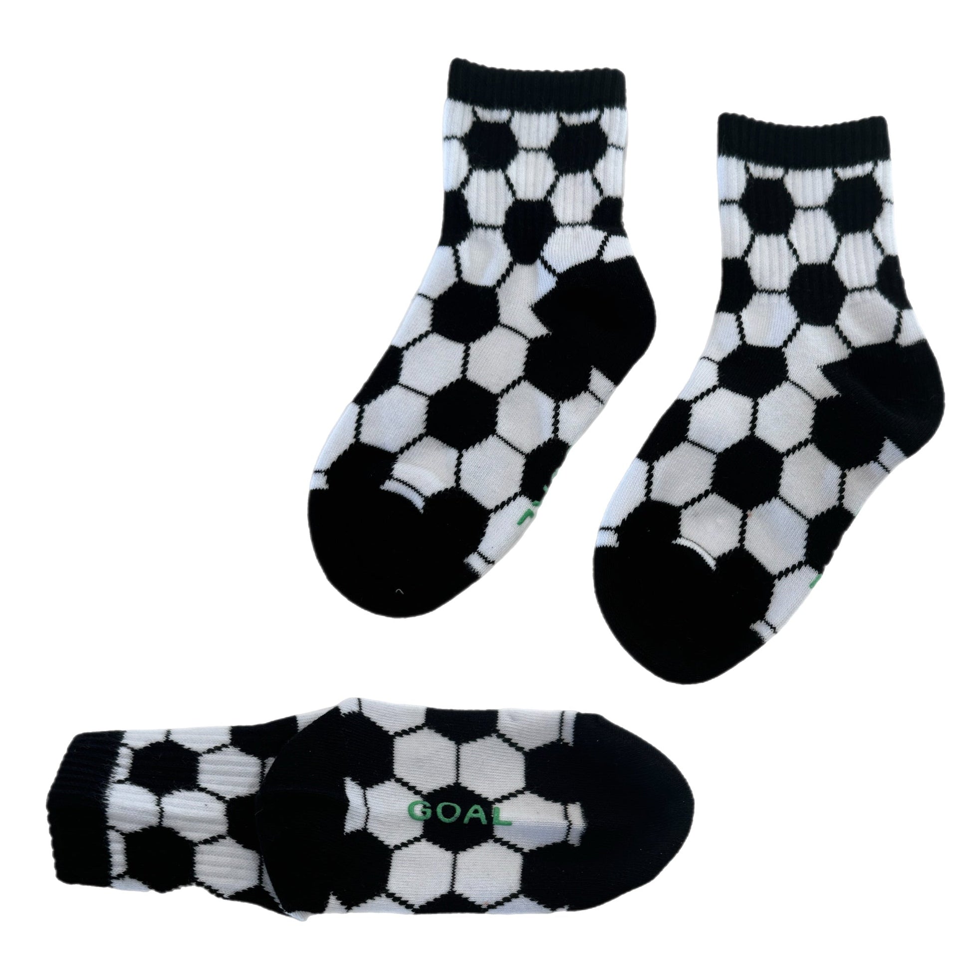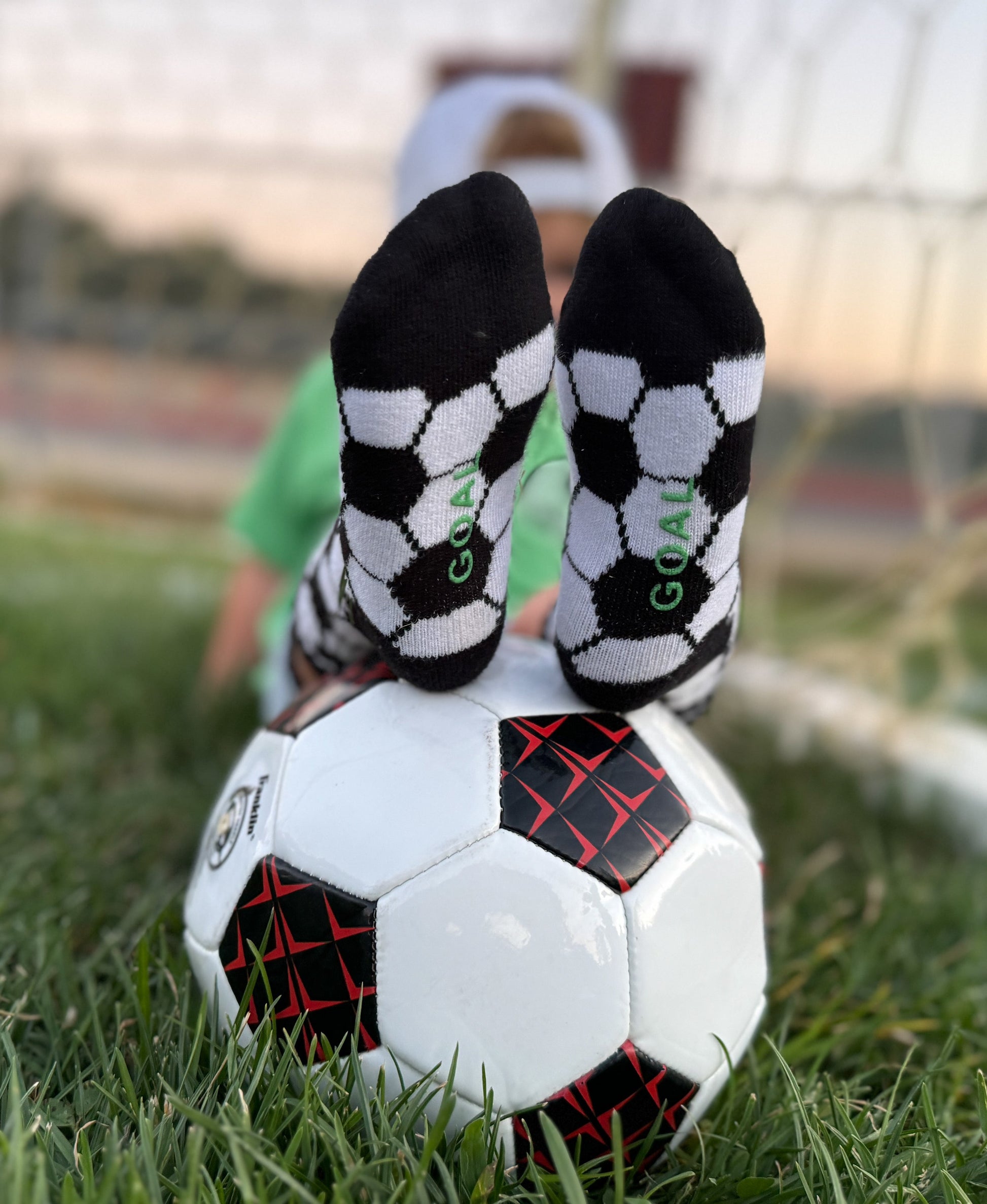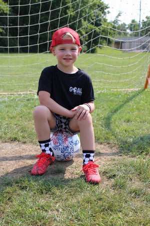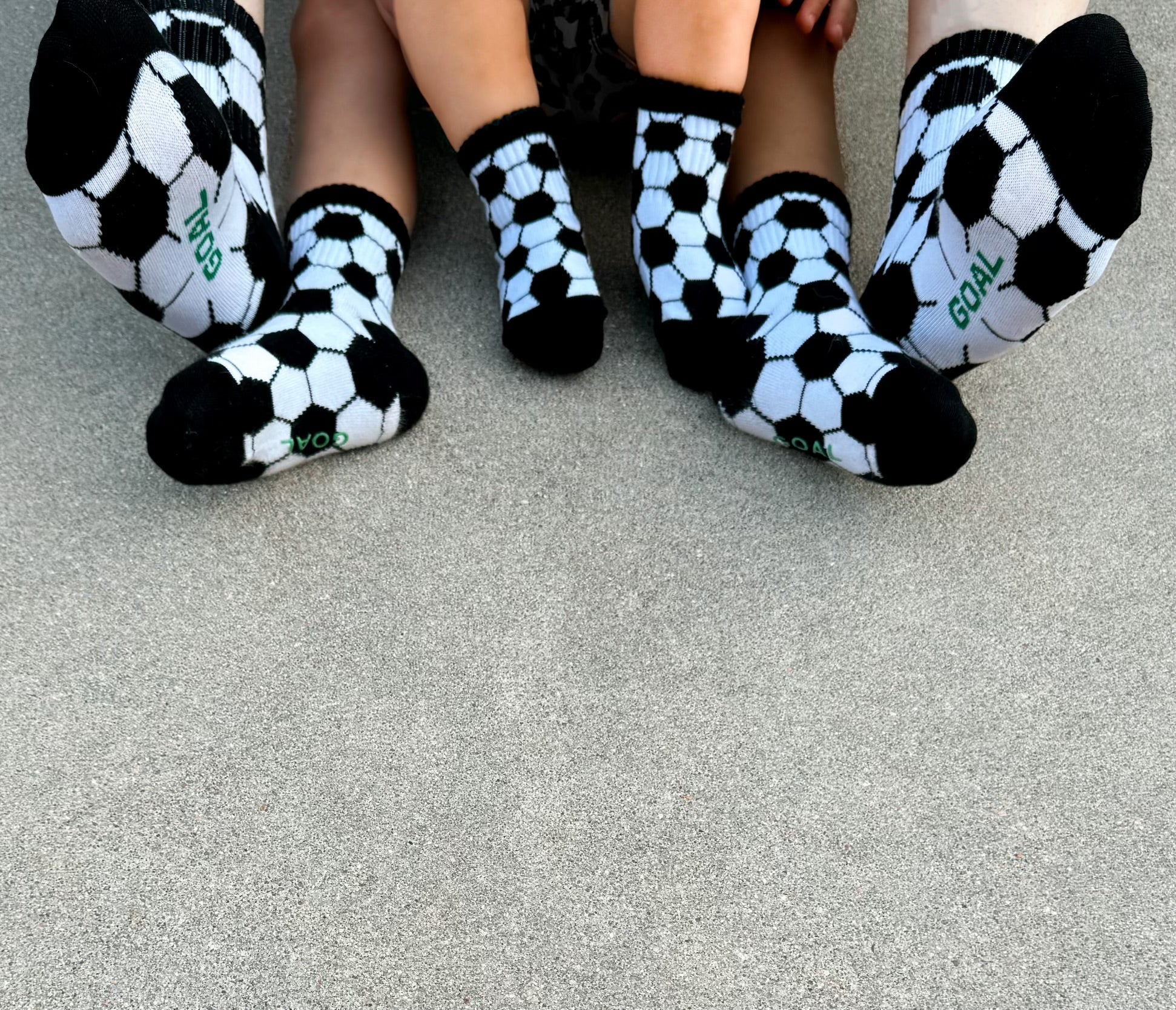 Sizes Infant, Extra Small, Small + Medium have "goal" written grips on the bottom of the feet and size Large have a stitched logo on the bottom of the feet.