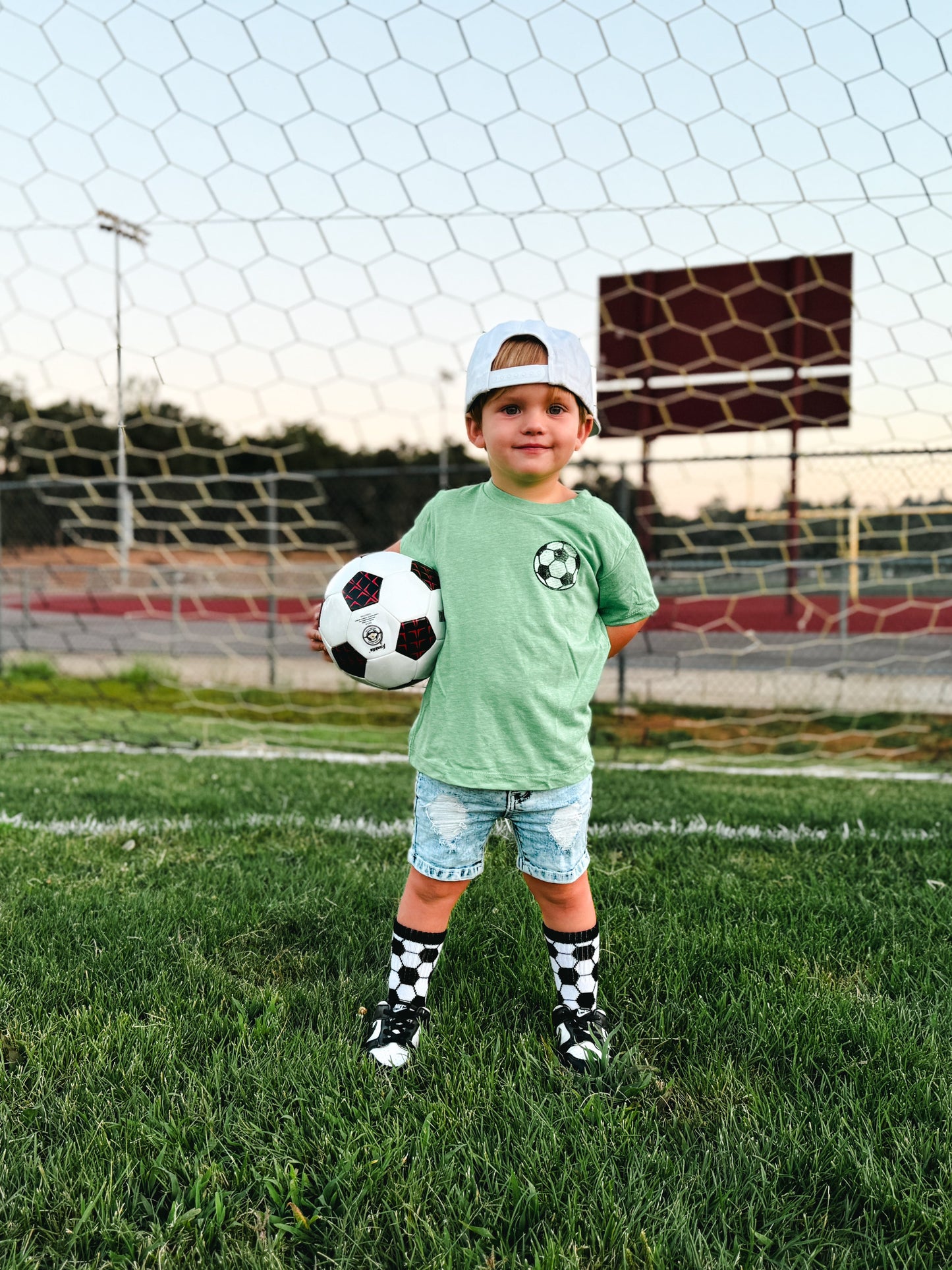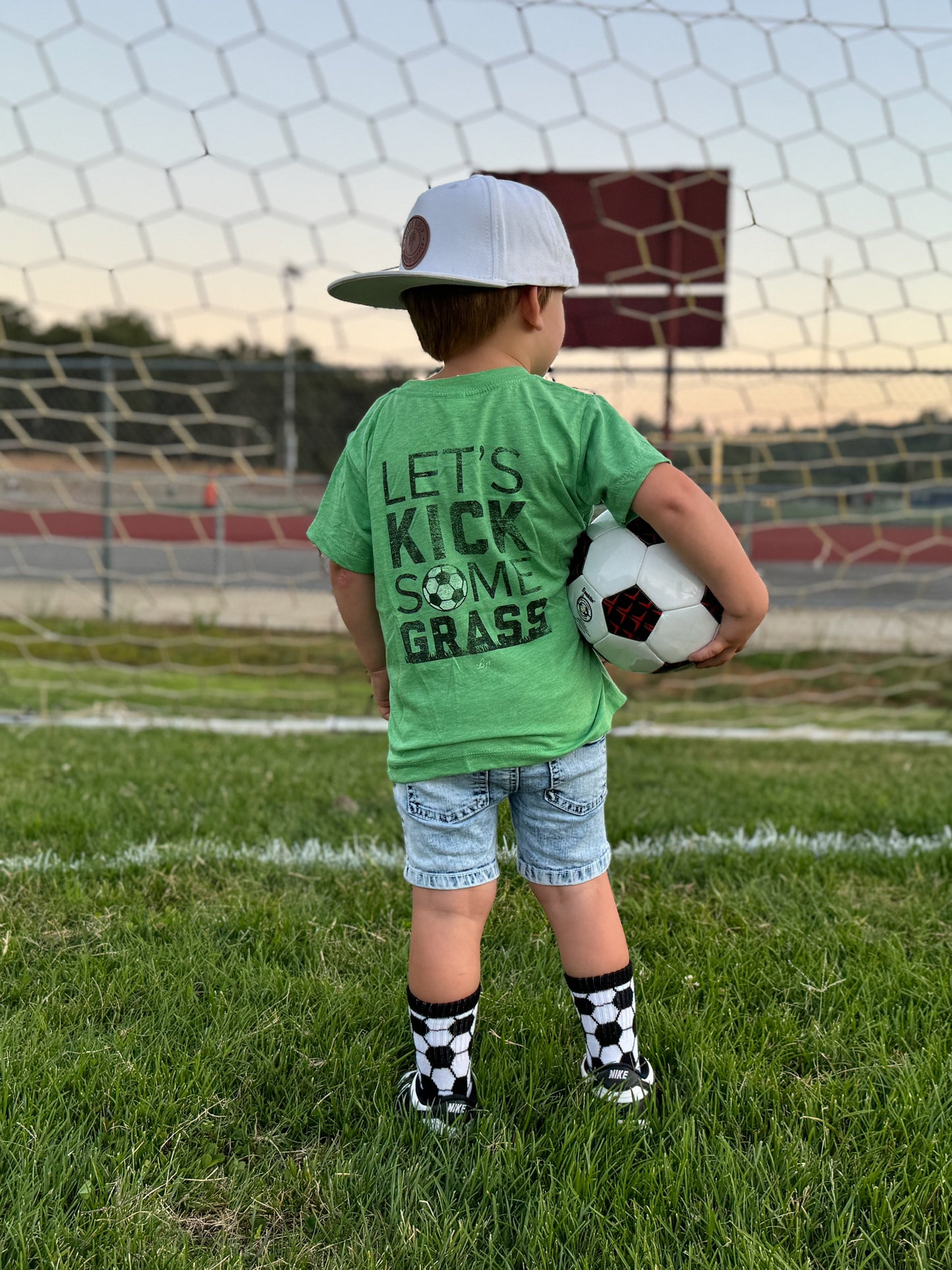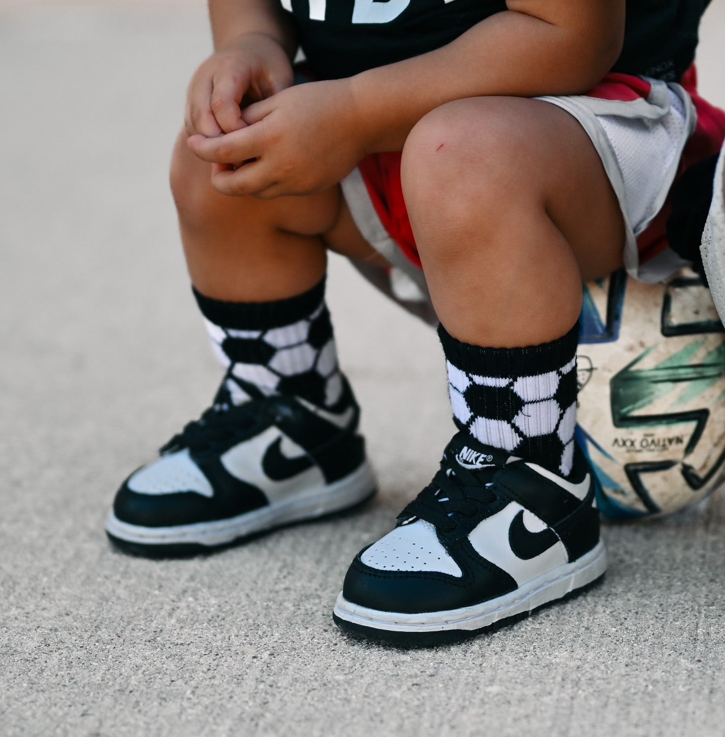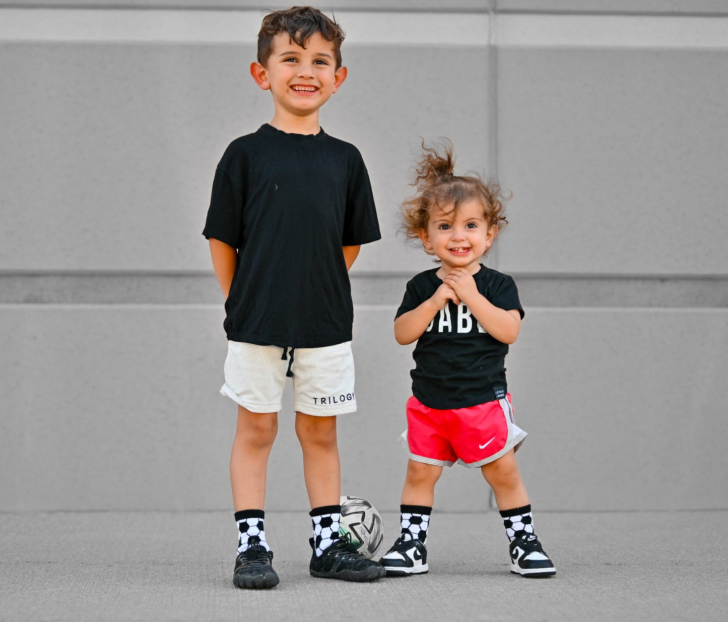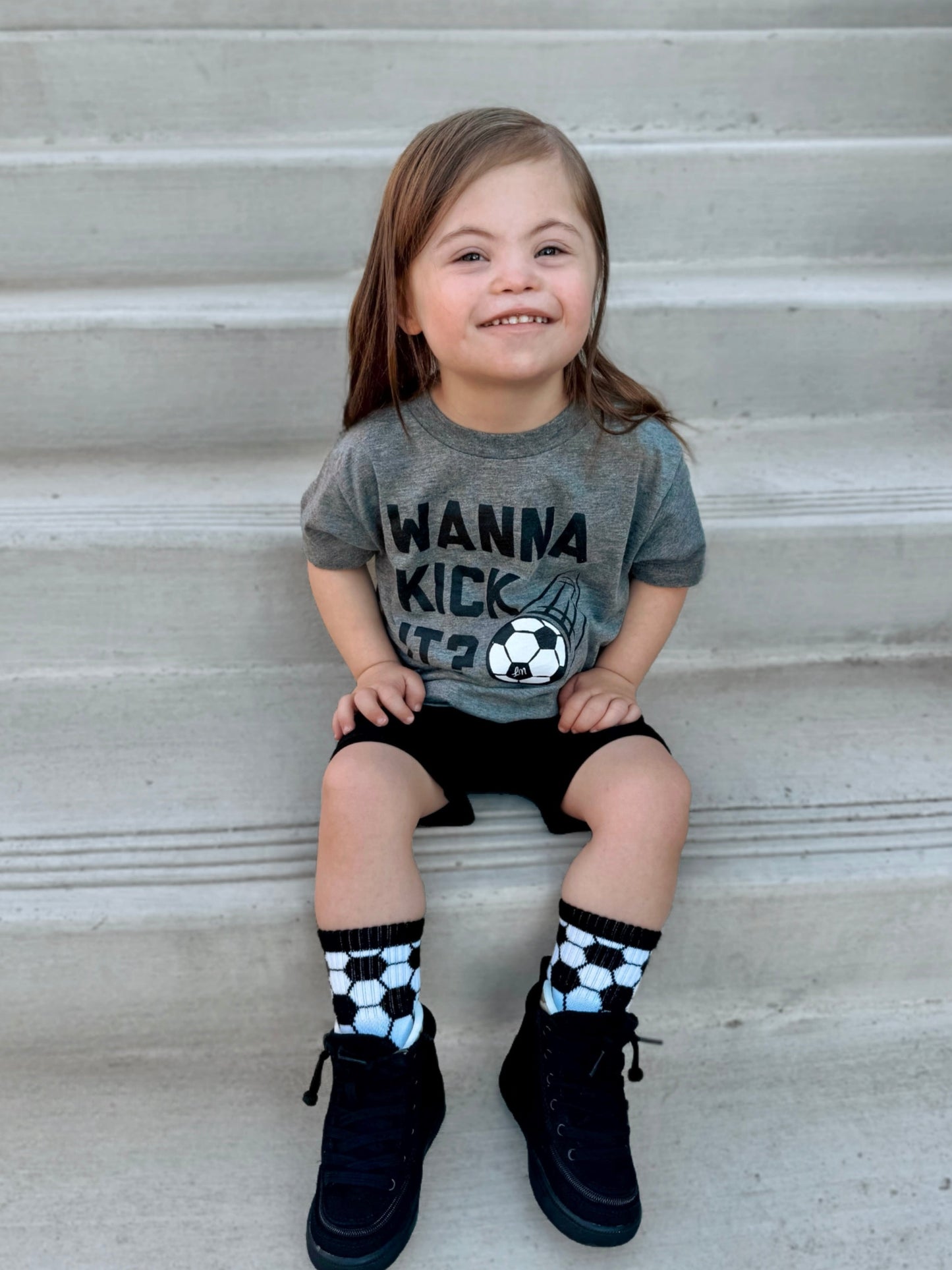 Sizes Infant, Extra Small, Small + Medium have "goal" written grips on the bottom of the feet and size Large have a stitched logo on the bottom of the feet.