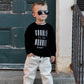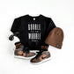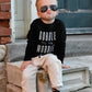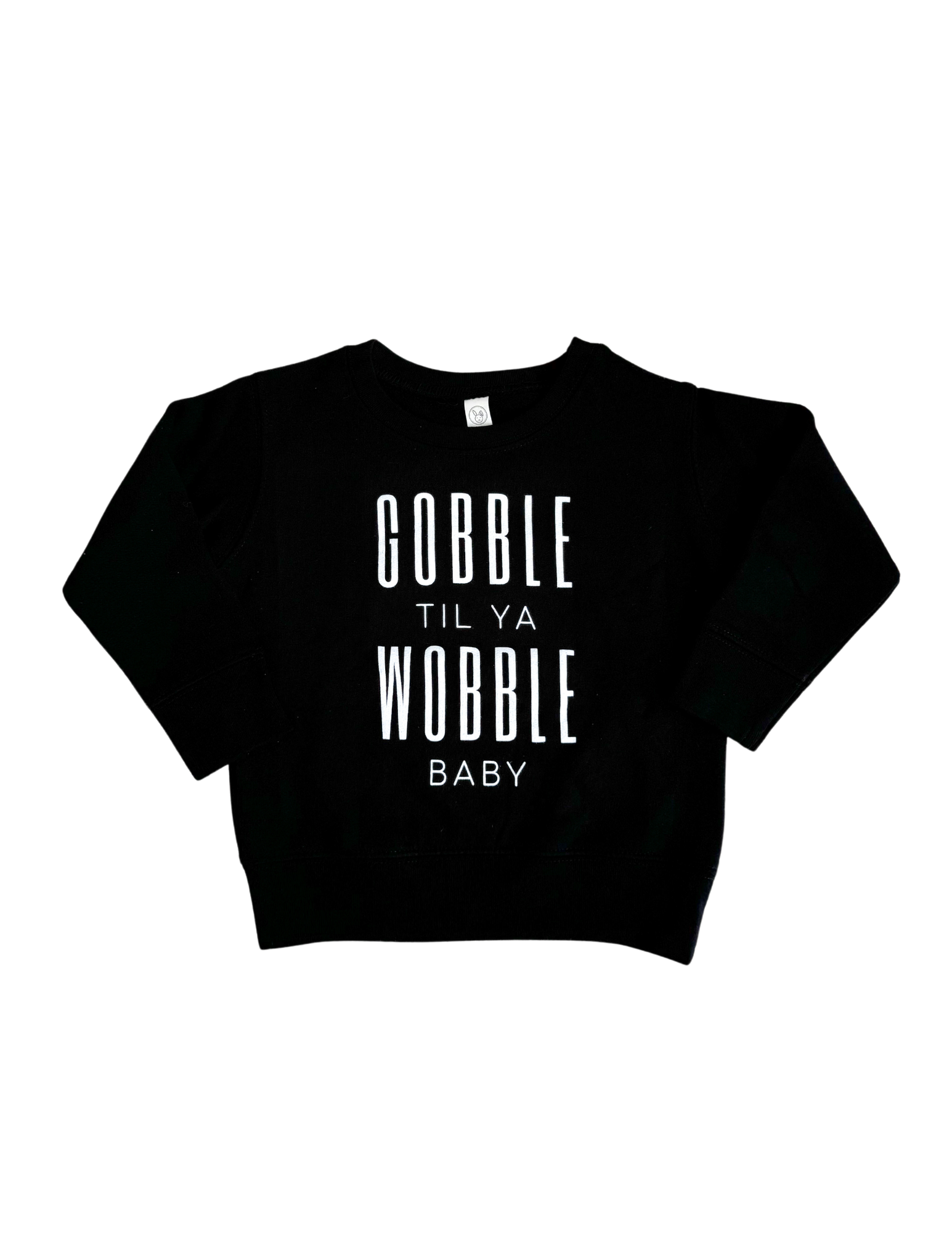 Black crew with white screen print design.