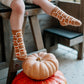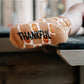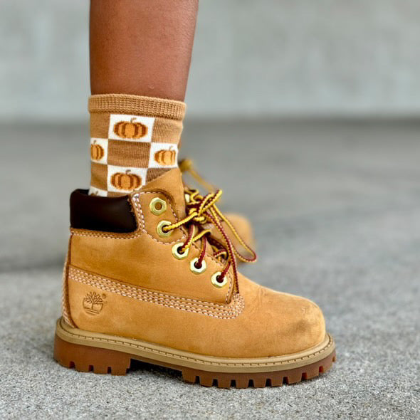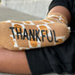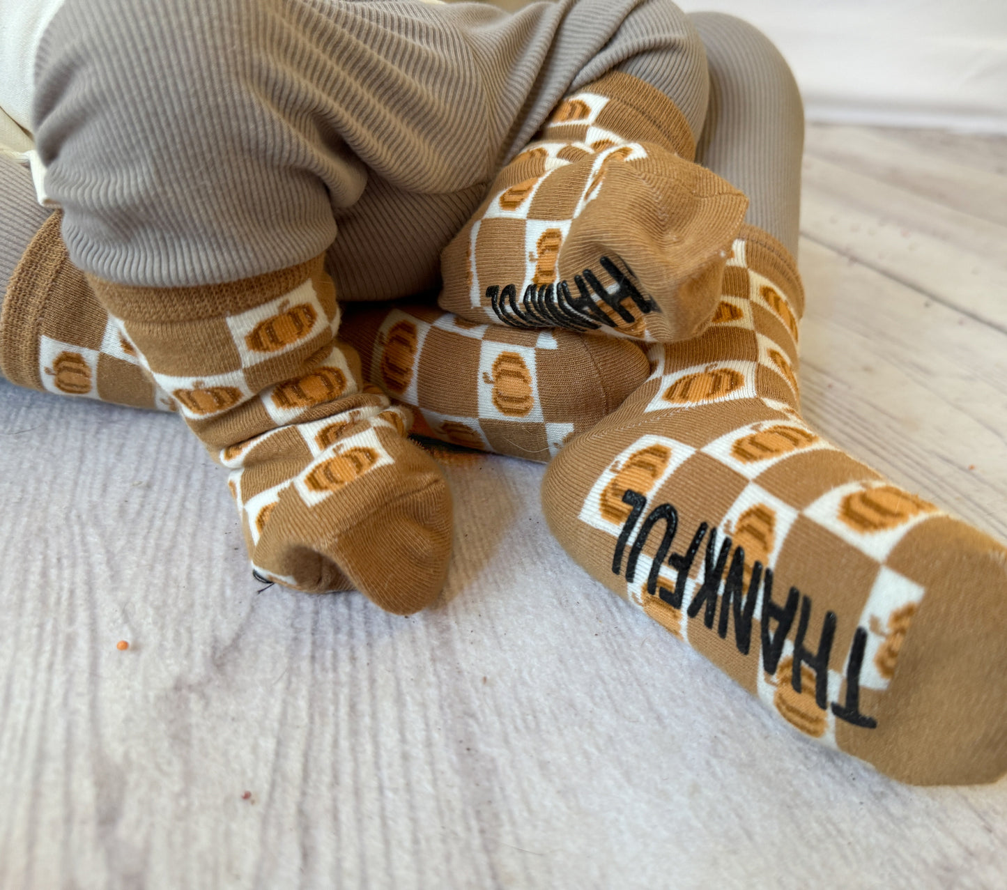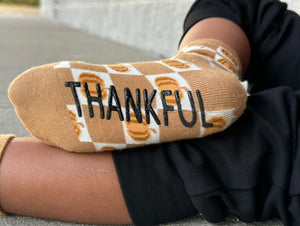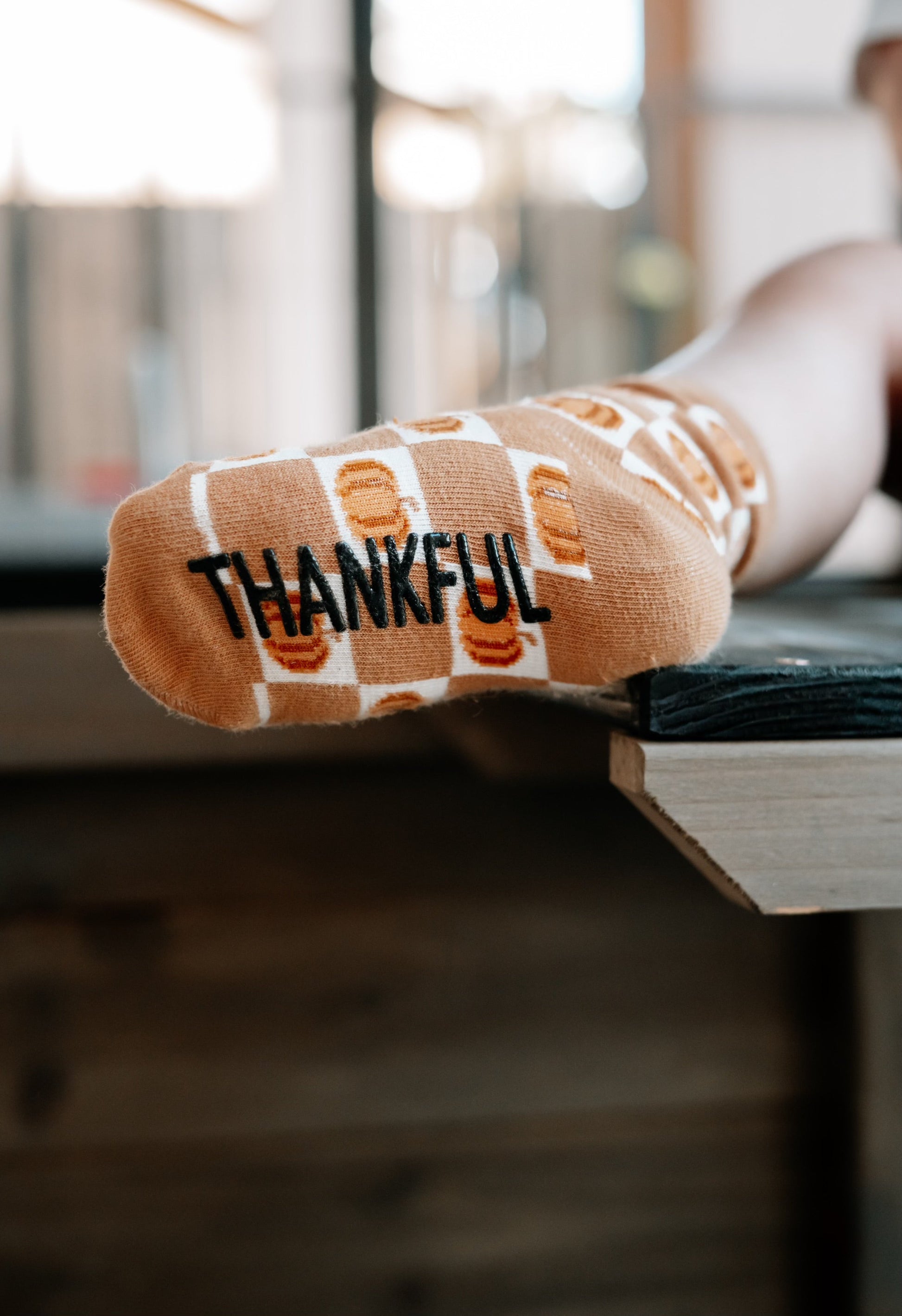 Sizes Infant/XXS, Extra Small, Small + Medium have "THANKFUL" grips on the bottom of the feet and size large have a stitched  "THANKFUL" on the bottom of the feet.