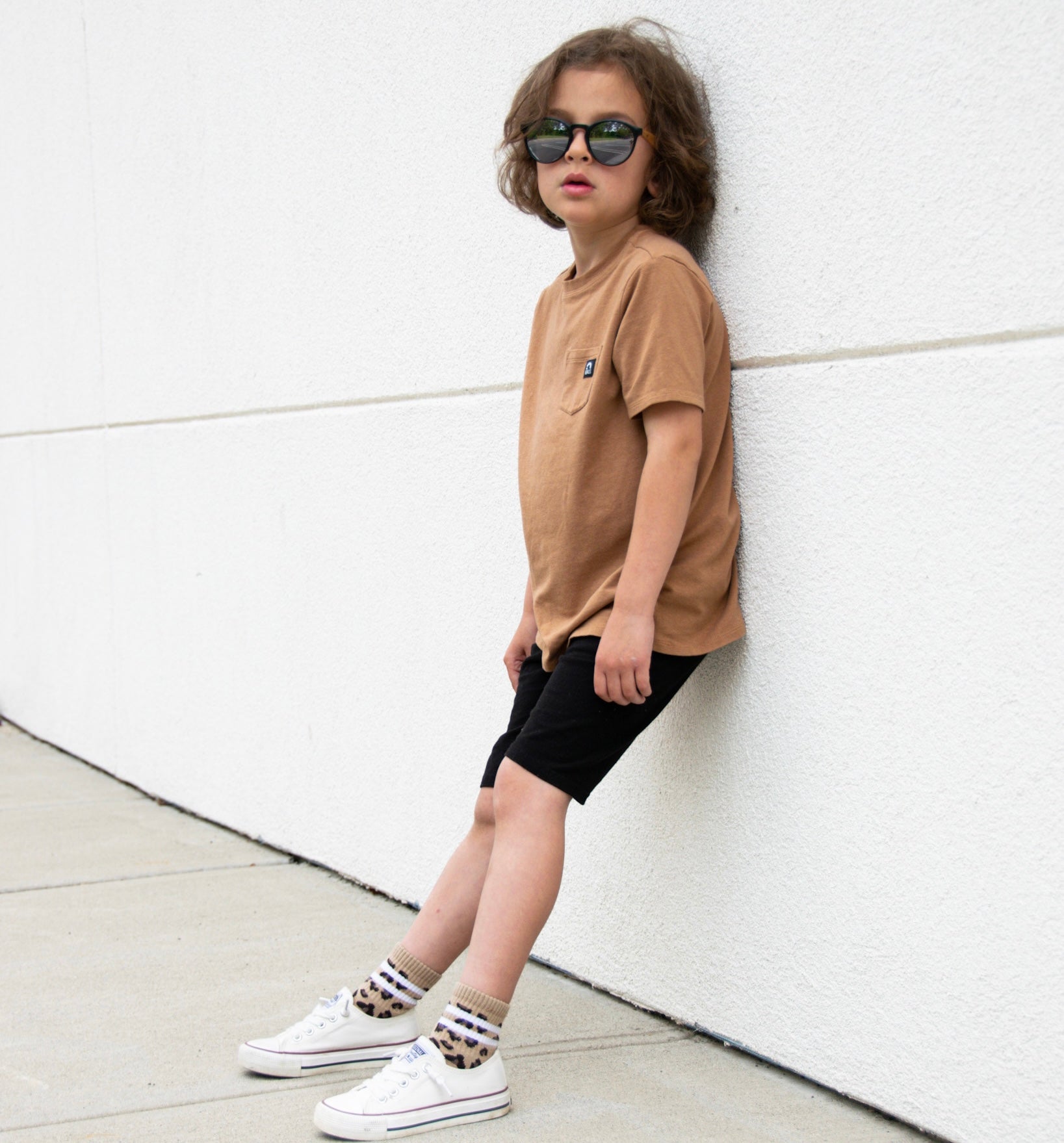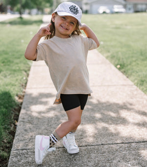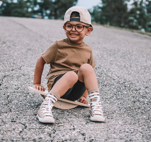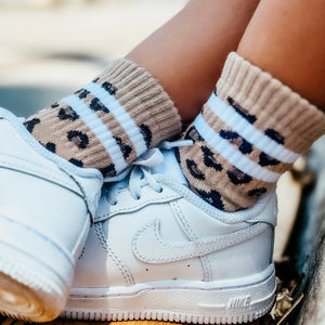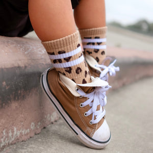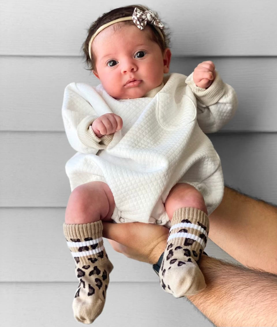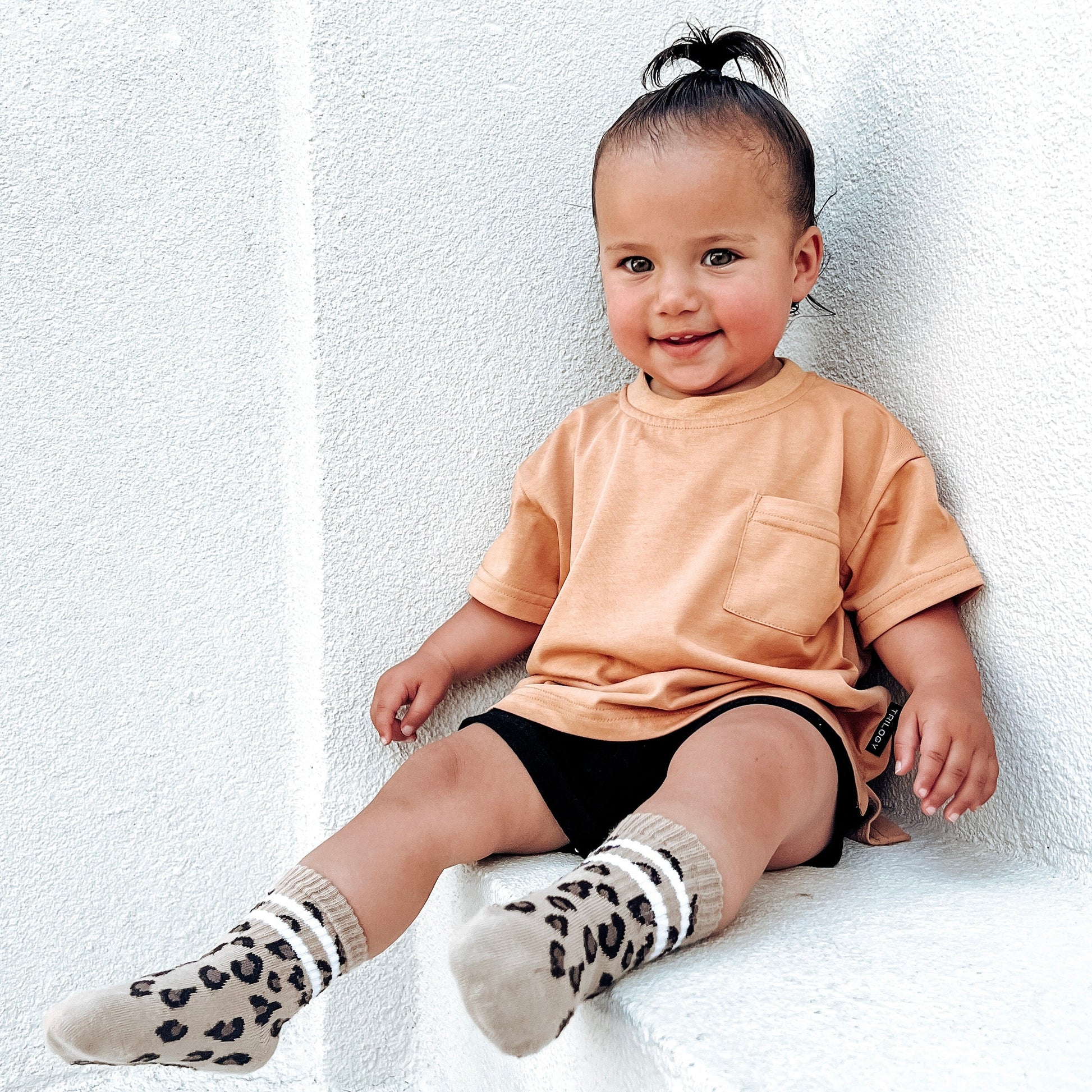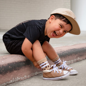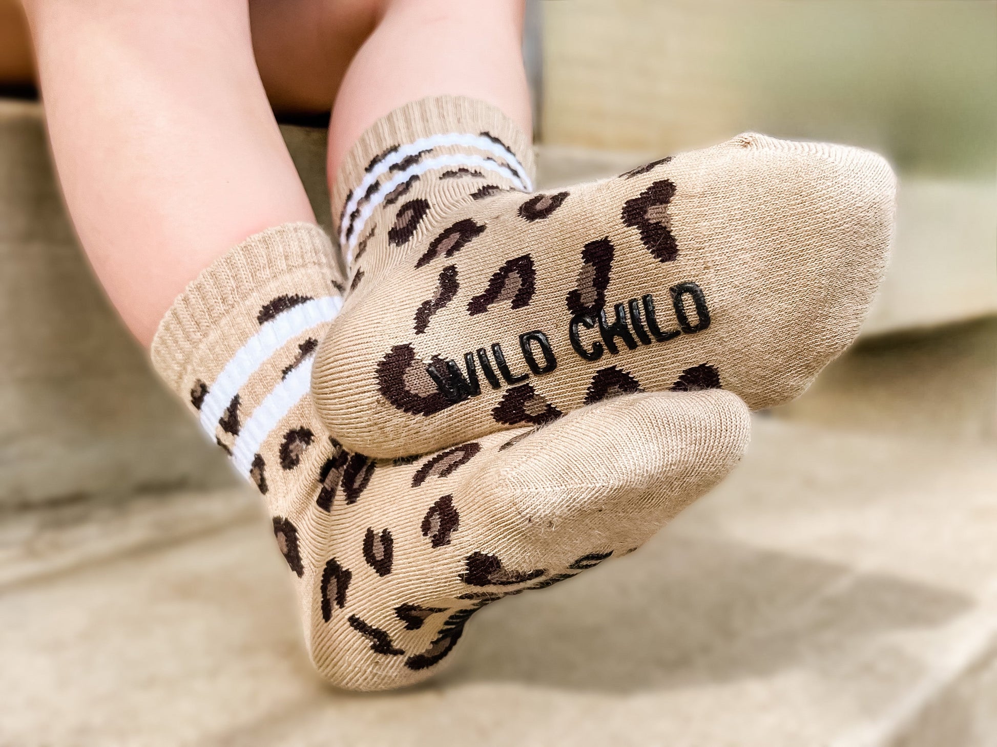 Sizes Infant/XXS, Extra Small, Small + Medium have "Wild Child" grips on the bottom of the feet and size large have a stitched "Wild Child" on the bottom of the feet.