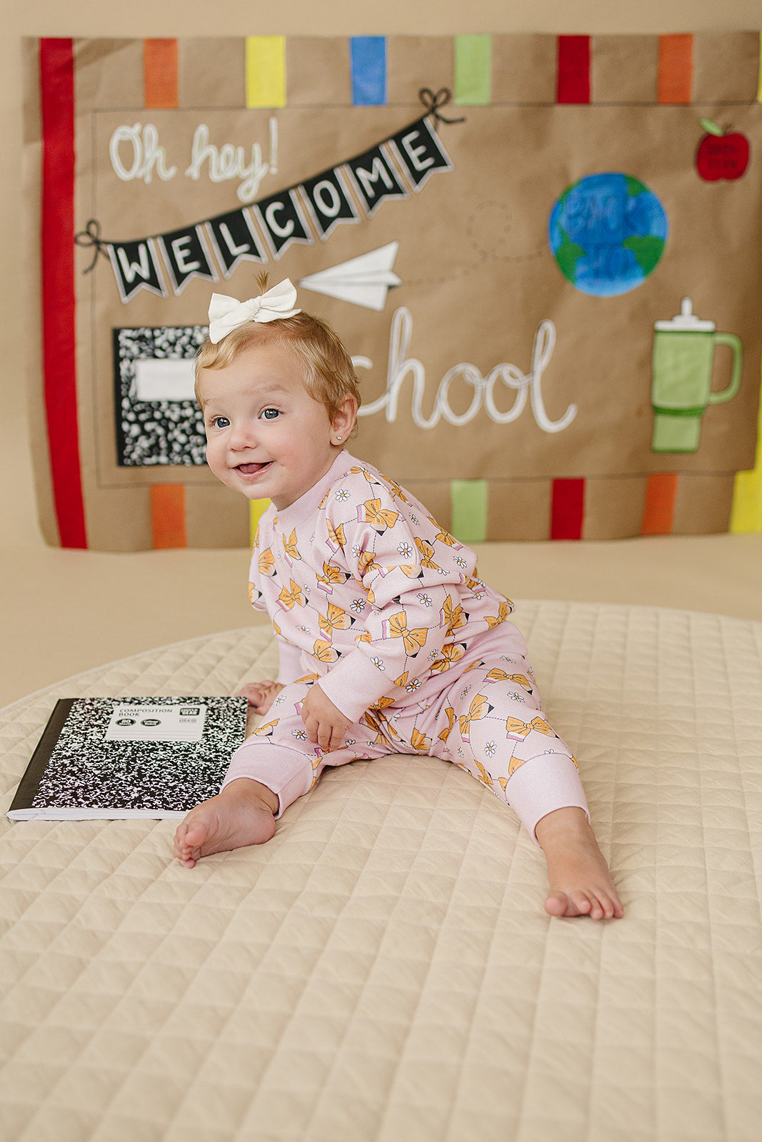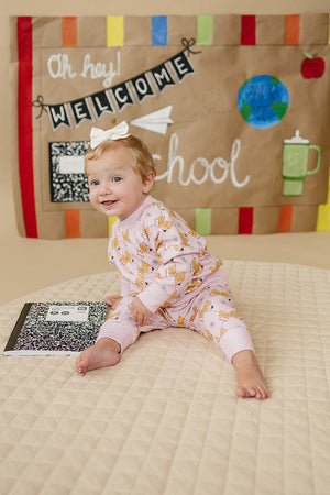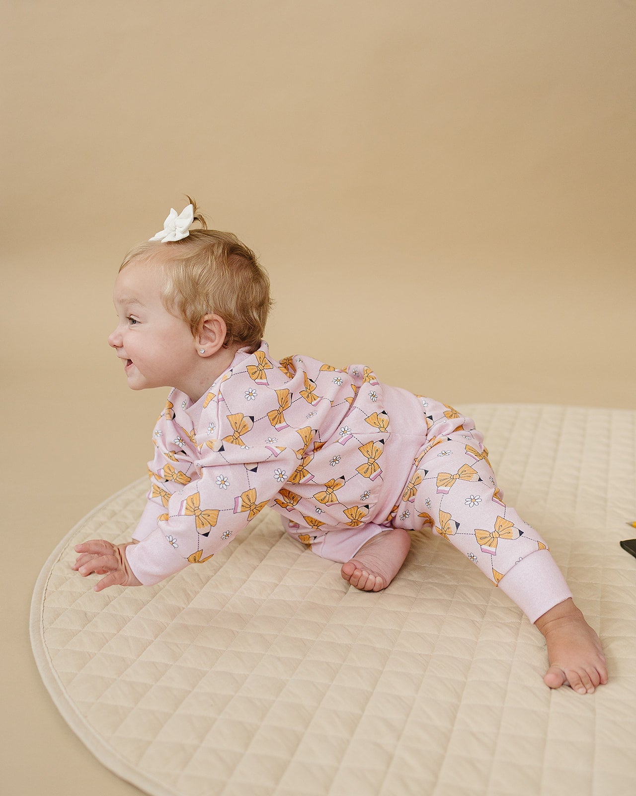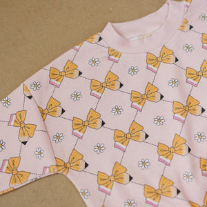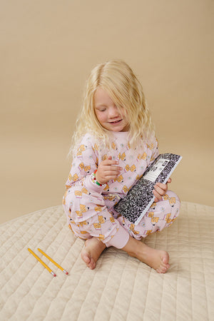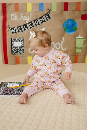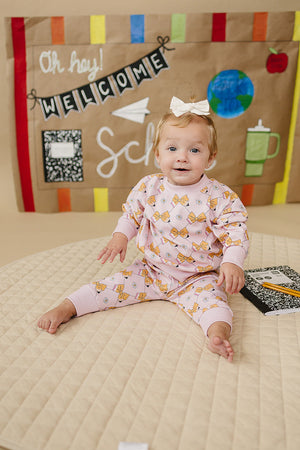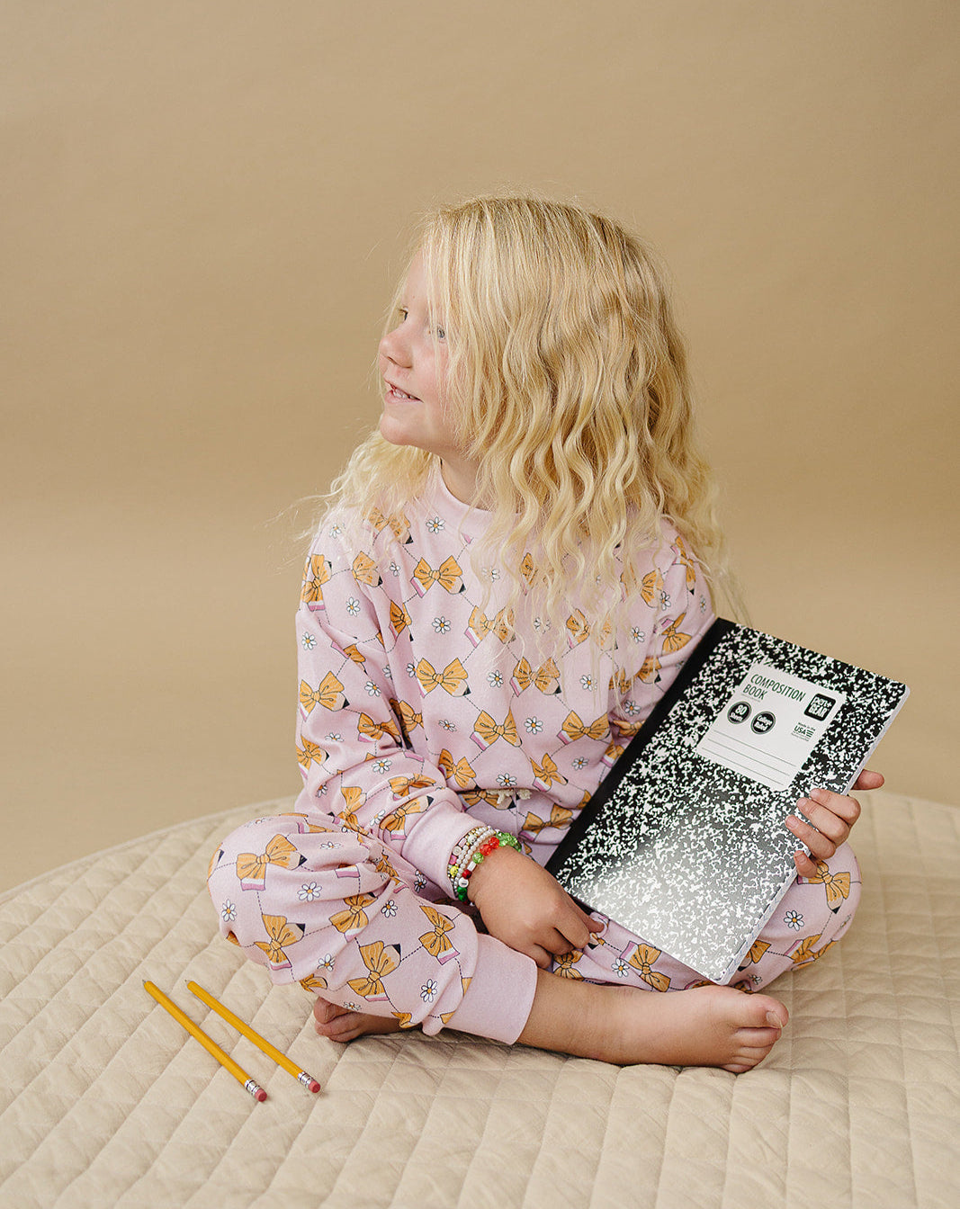 Pencil bows, daisy doodles, and the dreamiest shade of pink. The Jogger Set | Pixie Pencil is ready for recess, reading time, and after school snuggles.