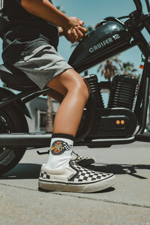 Sizes Extra Small, Small + Medium have logo grips on the bottom of the feet and size Large has a stitched logo on the bottom of the feet.