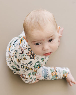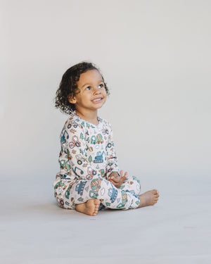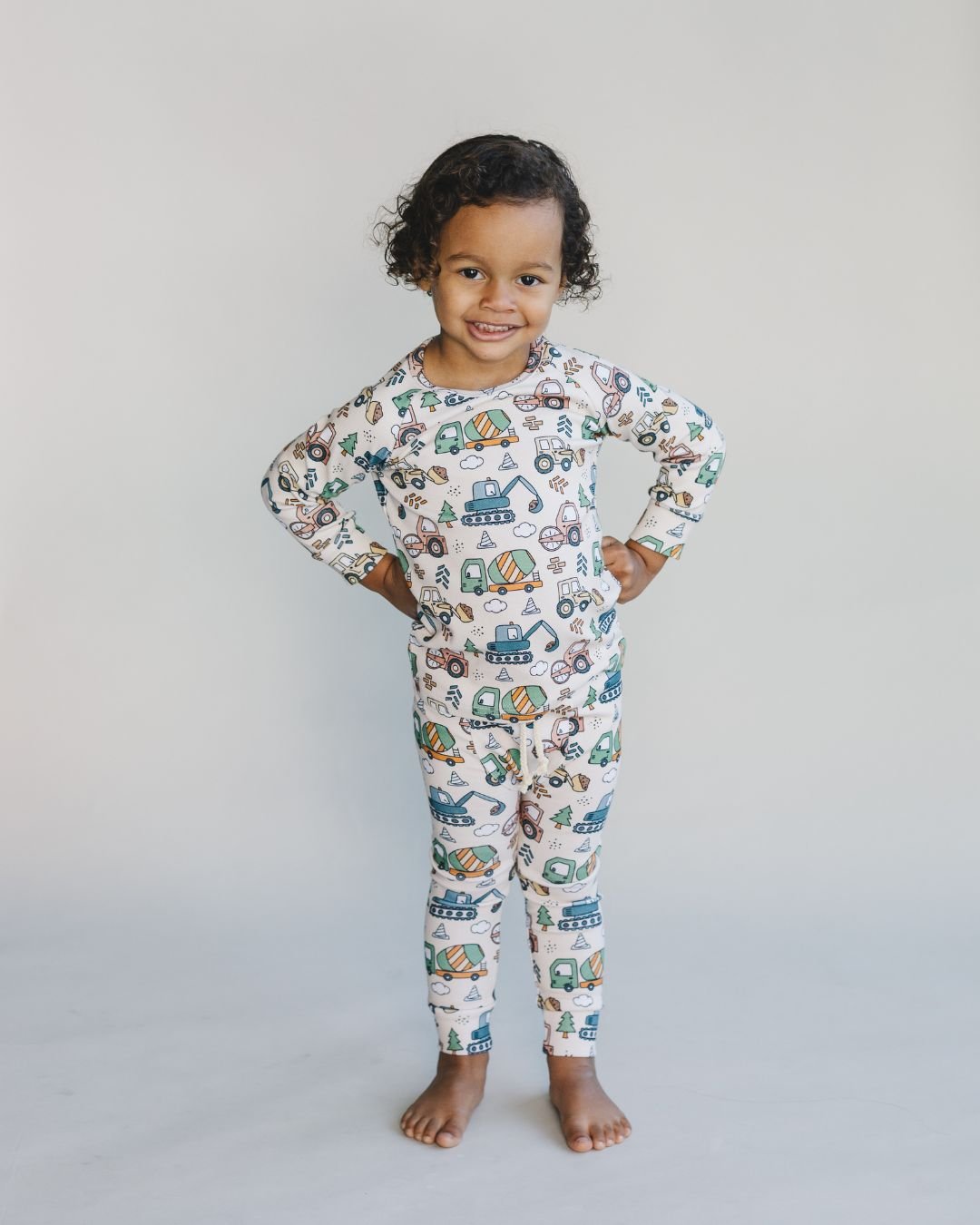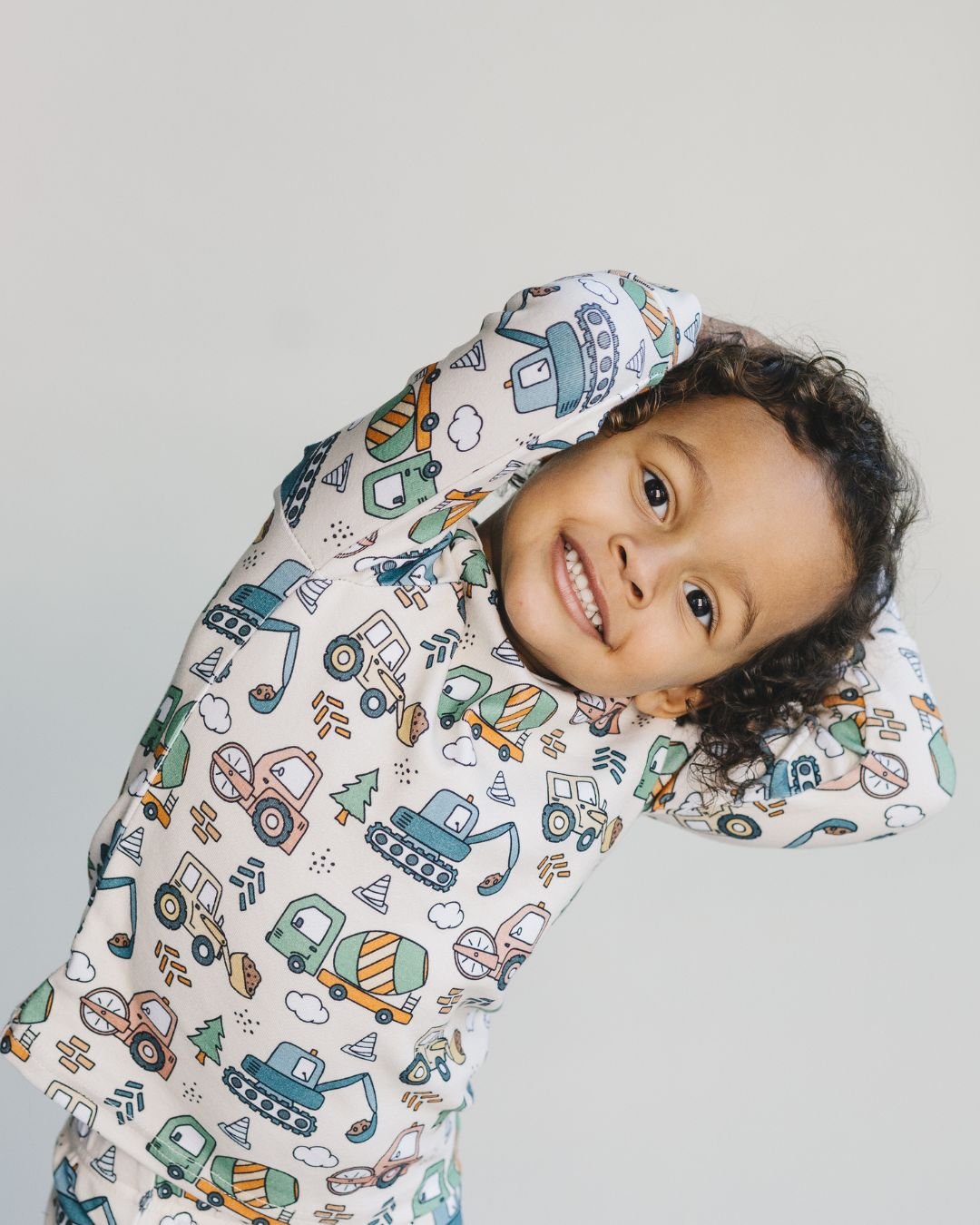 This adorable lounge set featuring construction trucks is a must-have! Made of ultra soft cotton and just the right amount of stretch, your little one will be comfy and cozy for any playtime activities! Bundle up in style with our popular lounge set!