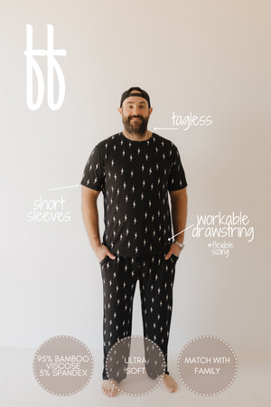 Our men's bamboo short sleeve and pant pajama set! Made of ultra-soft bamboo fabric, this set features a relaxed short sleeve top and comfortable, full-length pants. Be sure to look at our baby and toddler pajamas in this matching print!