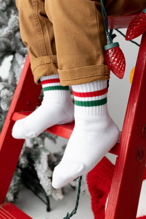Sizes Infant, Extra Small, Small, Medium have logo grips on the bottom of the feet large have a stitched logo on the bottom of the feet.