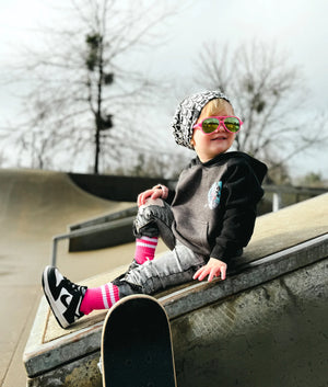 Sizing: Infant/XXS 0-3 Toddler Extra Small 3-6 Toddler Small 7-10 Toddler Medium 10-13 Toddler/Kids Large 1-7 Big Kids/Womens 4-10/Mens 4-8 Sizes Extra Small + Small have logo grips on the bottom of the feet and Medium + large have a stitched logo on the bottom of the feet.