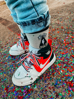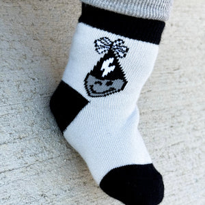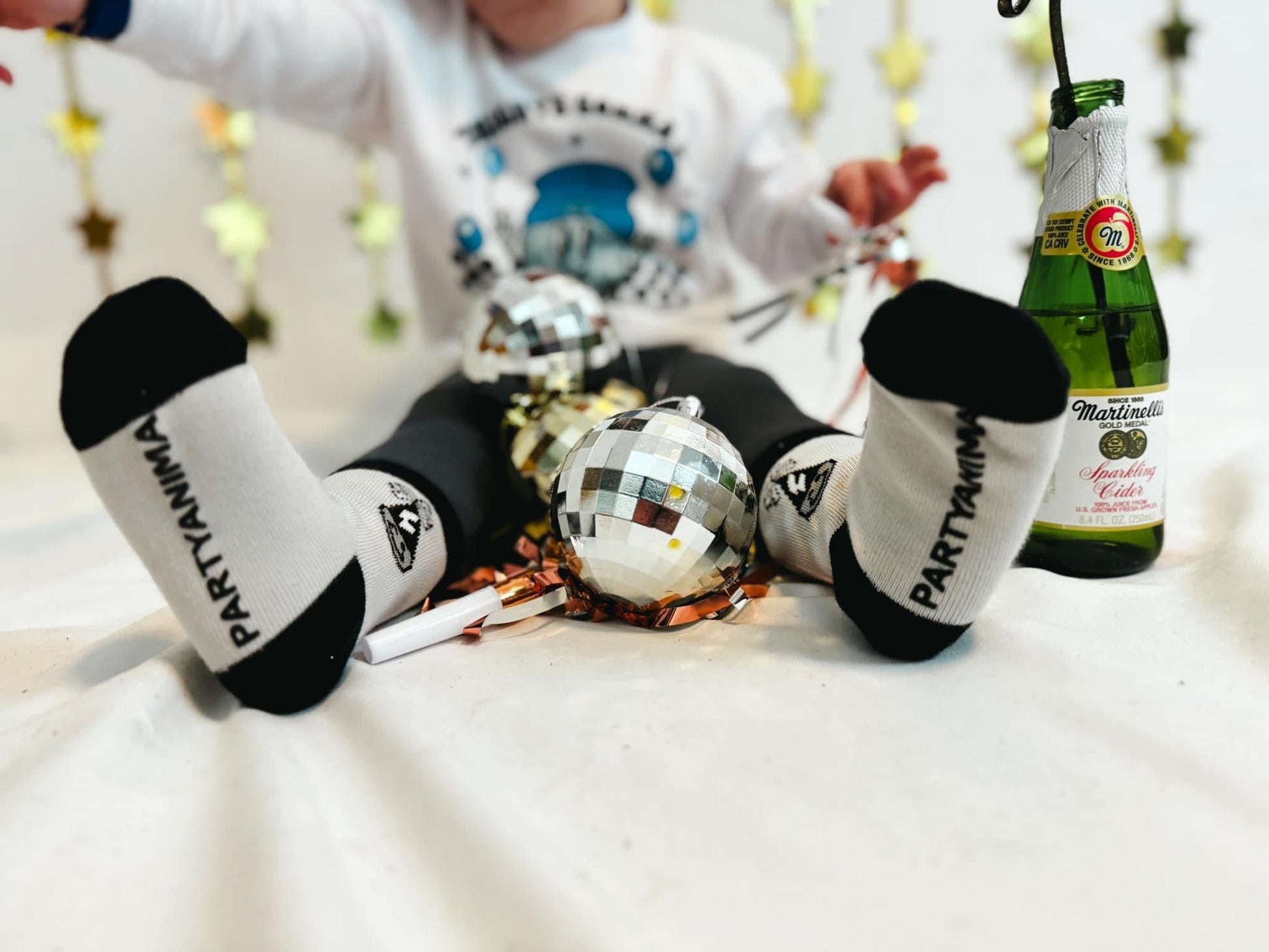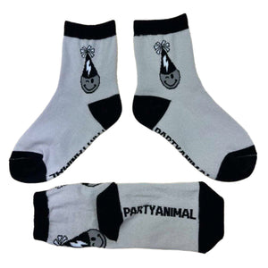 Sizes Infant/XXS, Extra Small, Small + Medium have "Party Animal" grips on the bottom of the feet and size large have a stitched "Party Animal" on the bottom of the feet.