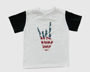Unisex fit screen printed red, white and blue graphic tee. These custom color block tees are true to size, soft and durable.