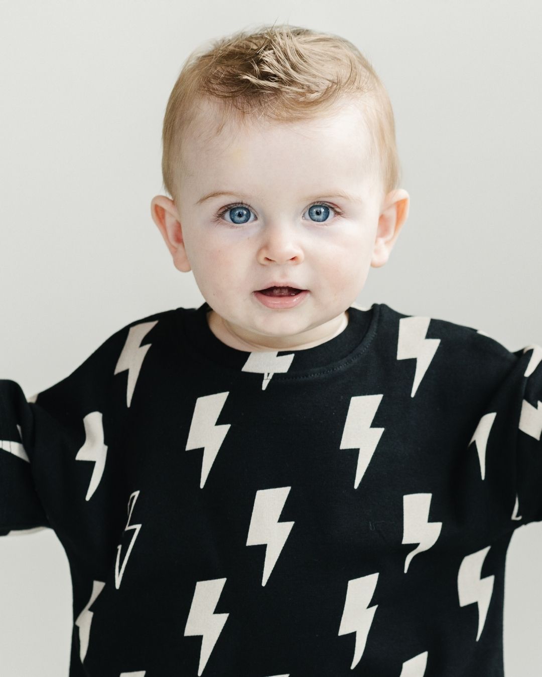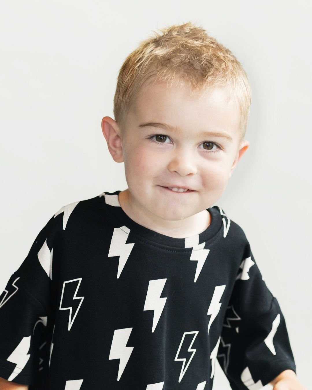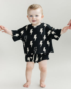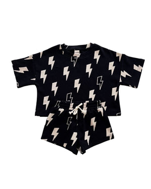This shorts set is made of high-quality cotton and boasts a trendy lightning bolt design. The set comes with an oversized top and true to size shorts in sizes NB-9Y. The material is 95% cotton and 5% spandex for maximum comfort.