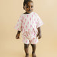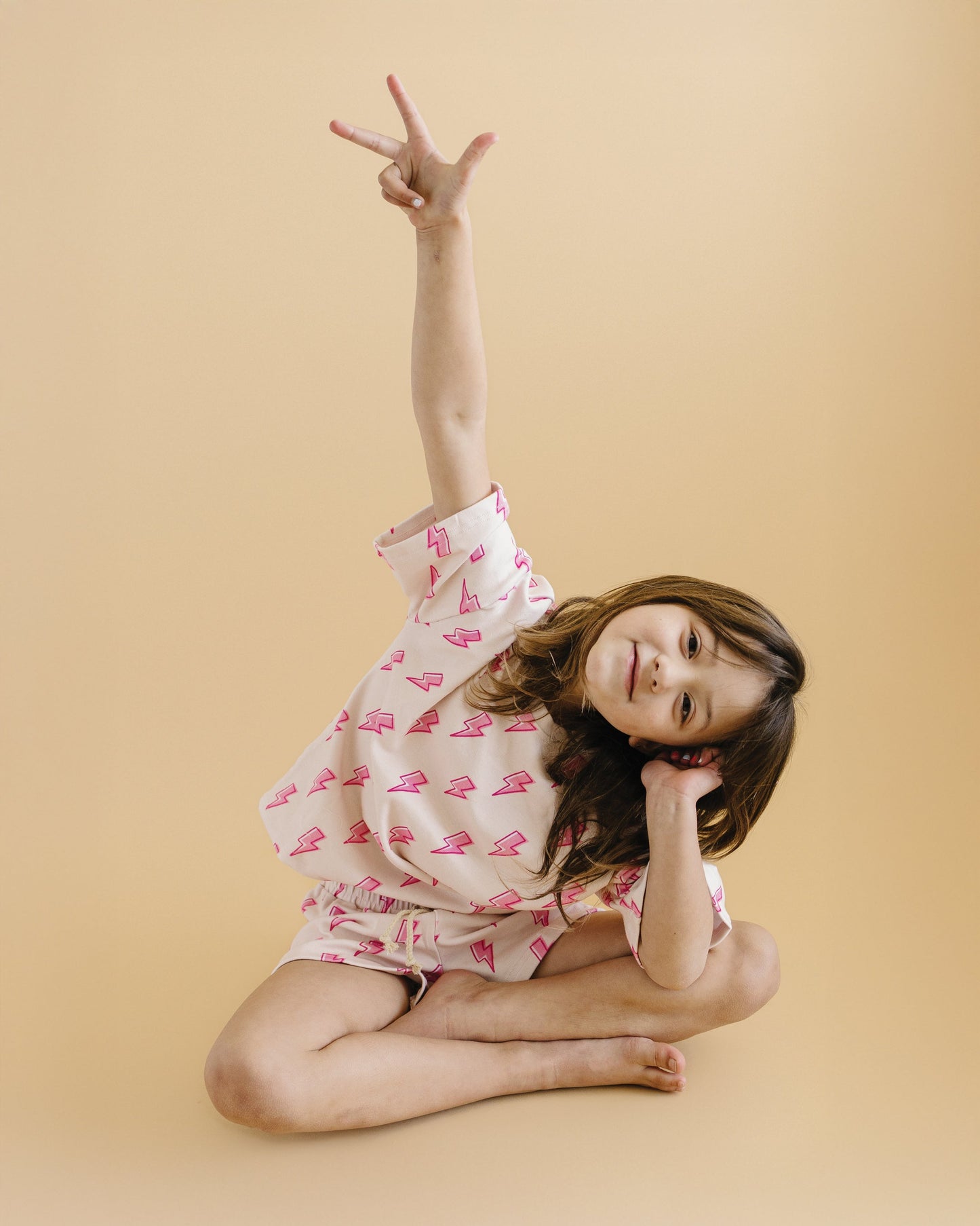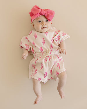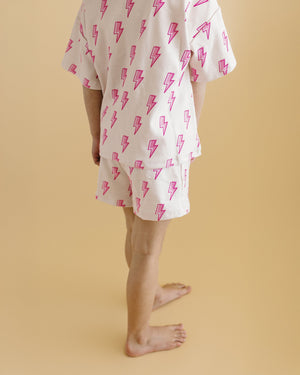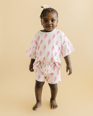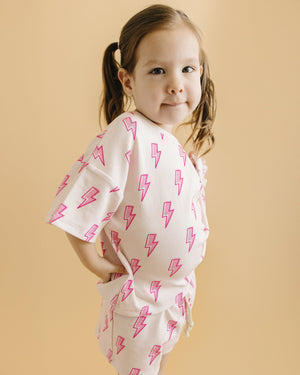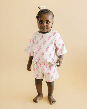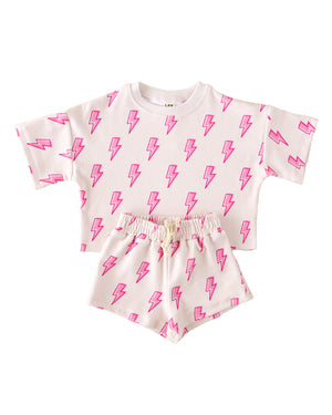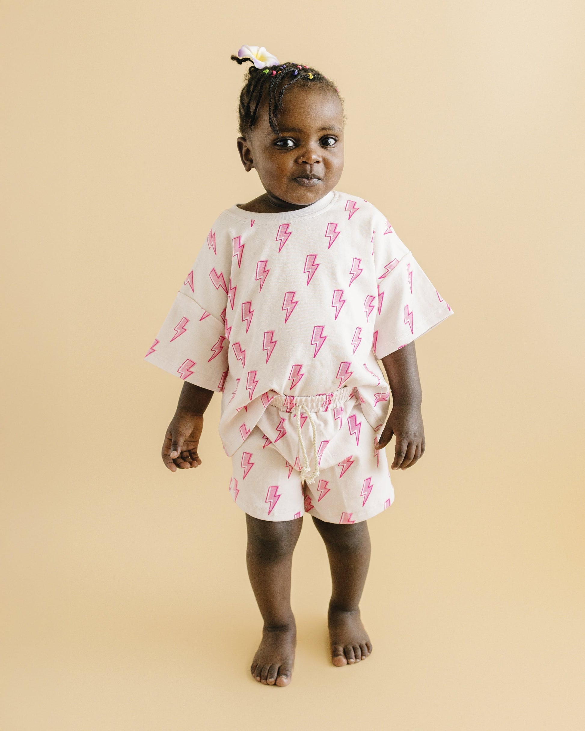 Add a bold twist to their wardrobe with our Pink Bolts shorts set! Featuring a solid pink background with dark pink lightning bolts, this set combines vibrant color with an energetic design. Ideal for playtime or casual outings, it’s made for comfort and style throughout the day.