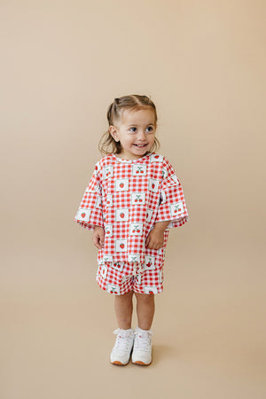 Let your little one stay fresh and adorable in the Shorts Set | Strawberry Gingham — a go-to for sunny days and sweet memories!