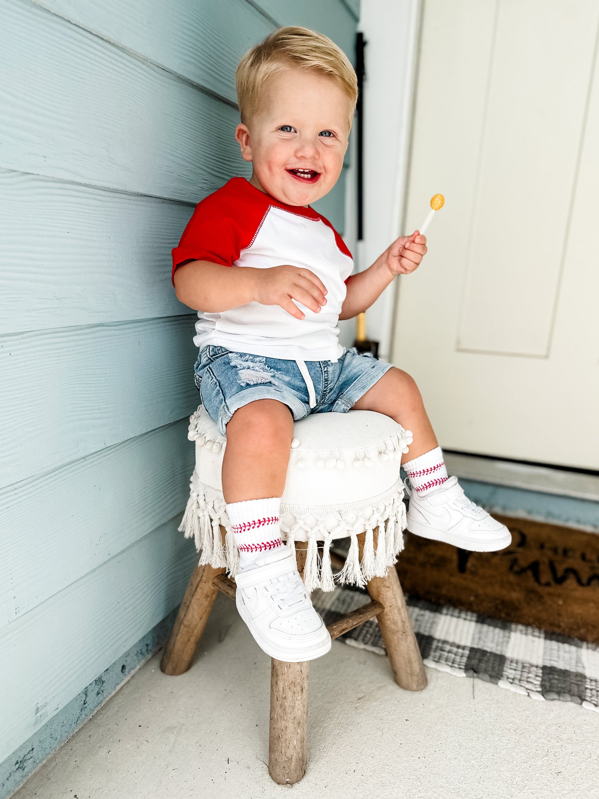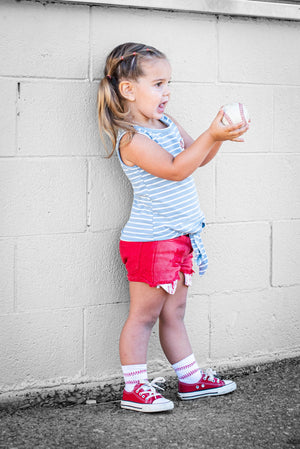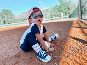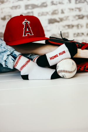 Sizes Infant/XXS, Extra Small, Small + Medium have grip "Home Run" on the bottom of the feet and size large have a stitched "Home Run" on the bottom of the feet.