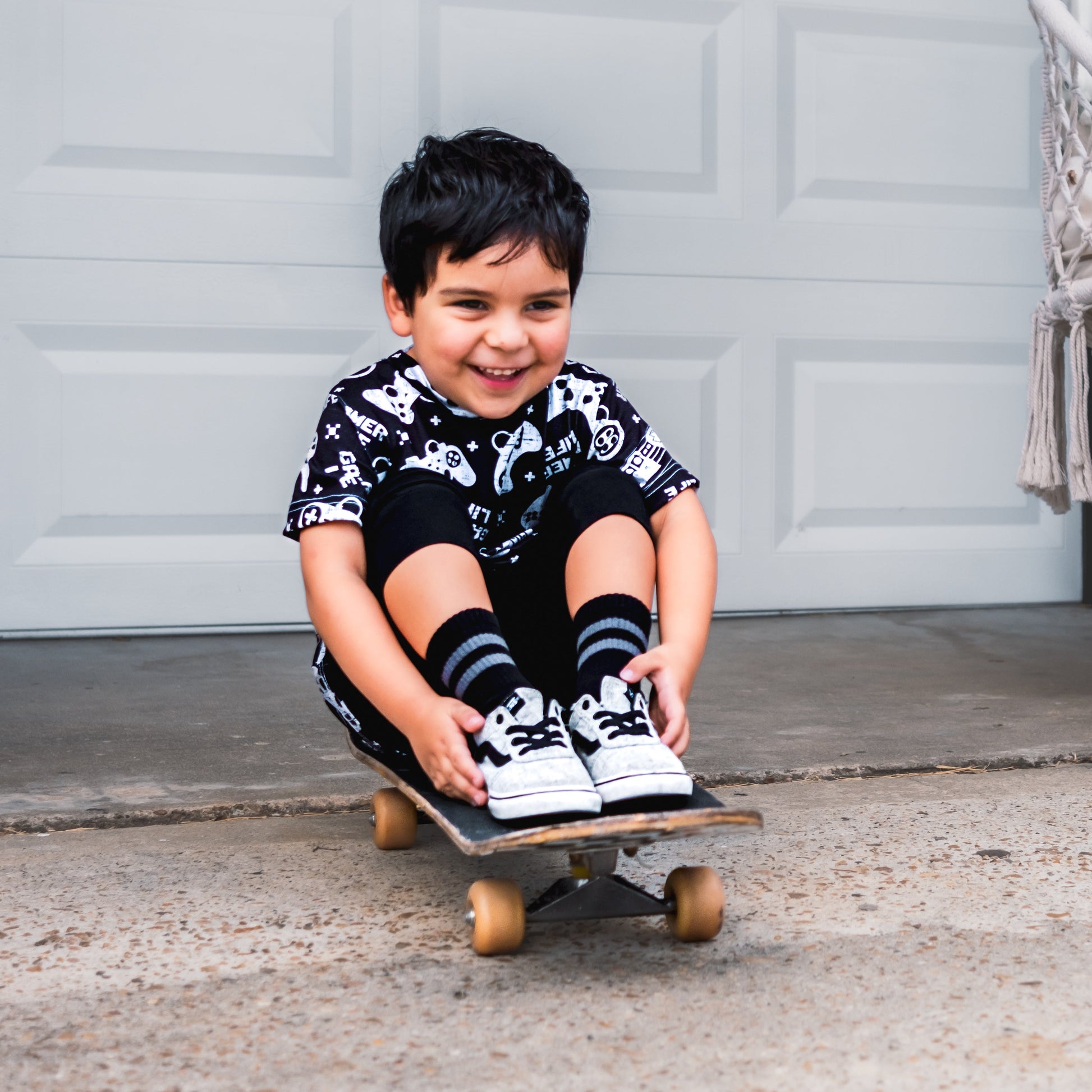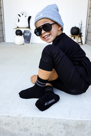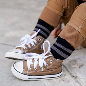Sizes Infant/XXS, Extra Small, Small + Medium have logo grips on the bottom of the feet and size large have a stitched logo on the bottom of the feet.