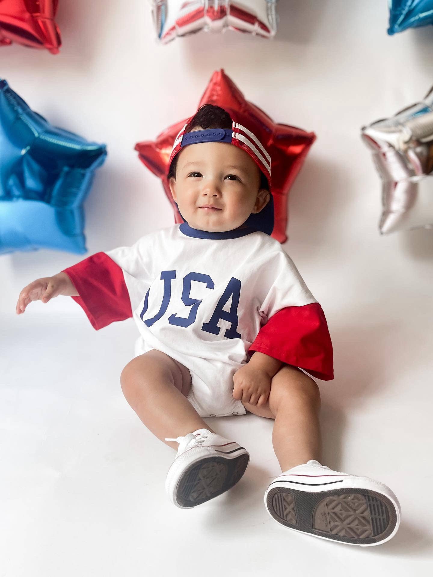 Our best selling USA romper is back. This oversized romper is so cute ! Colorblock sleeves with USA printed (not pressed) directly on the shirt.