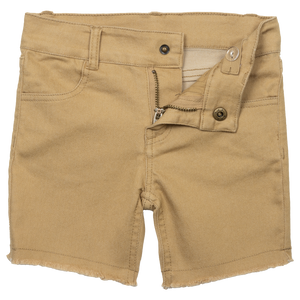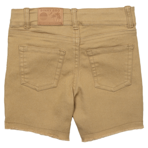 Our Waco Denim Shorts are made of a cotton/poly/spandex blend. They have a frayed bottom, a BinkyBro landscape logo on an artificial leather patch on back, custom buttons, and an adjustable waistband. They will fit like denim but have enough stretch in them to make them comfortable. PLEASE TAKE NOTE OF A FEW THINGS: * These are designed to be fitted and land above the knee. (Not baggy at all.) * Size chart can be found below (waist measurement is of a folded pair) 6 months - 12 months - Waist 21cm - Length 19cm - Inseam 6cm 12 months - 18 months - Waist 22.5cm - Length 19cm - Inseam 6cm 18 months - 24 months - Waist 24cm - Length 21cm - Inseam 6cm 2 years - 3 years - Waist 26cm - Length 25cm - Inseam 10cm 4 years - 5 years - Waist 29cm - Length 27cm - Inseam 11cm 6 years+ - Waist 31cm - Length 30cm - Inseam 12cm