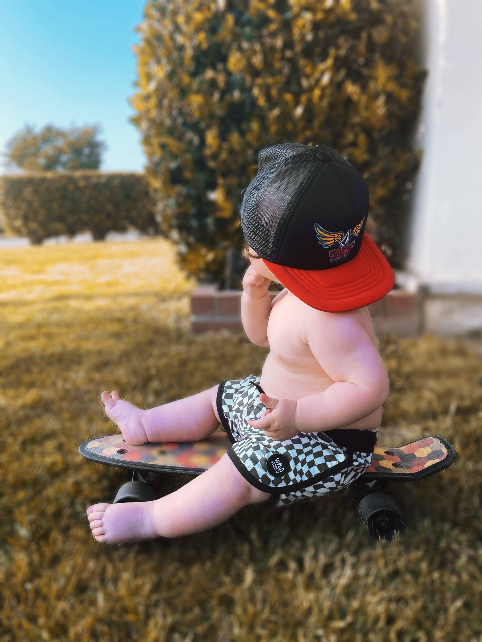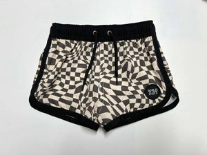 These are more than boardshorts! These are everyday shorts. Wavy charcoal & beige checkered design with light speckle Black waist band and trim. These lightweight boardshorts fit true to size. However if your little grom is in between sizes we suggest to size up. Everyday wear short without a mesh liner to provide more comfort Boardshorts come with a functioning drawstring. Machine wash & hang dry