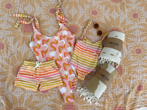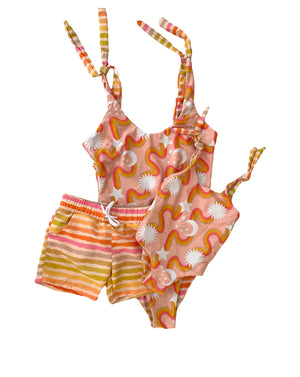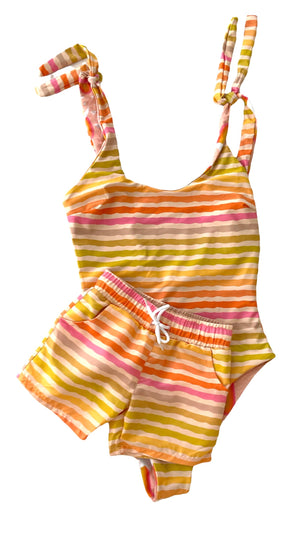 Women's reversible one piece with coordinating stripes matches our boys striped boardshorts and girls one piece.
