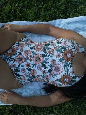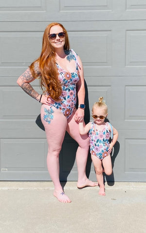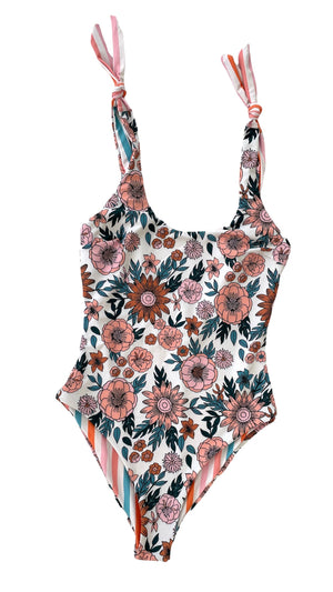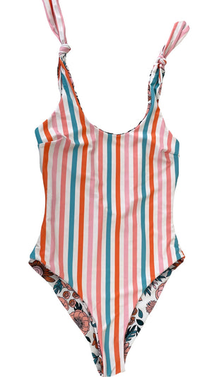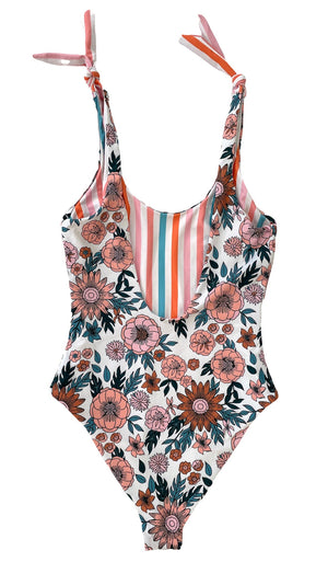 Women's reversible one piece with coordinating stripes matches our girls floral one-piece.