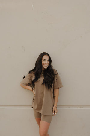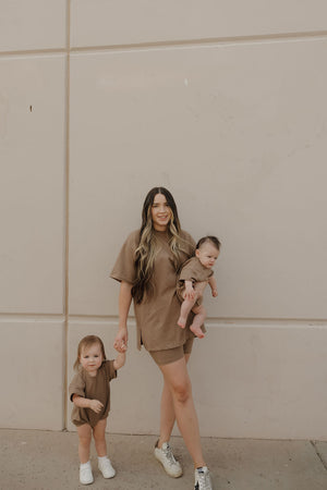 Everyone's favorite short sets are back! These sets feature a classic biker short and an oversized tee—perfect for any time of day. Be sure to check out our matching short sets and rompers for the kiddos, too!
